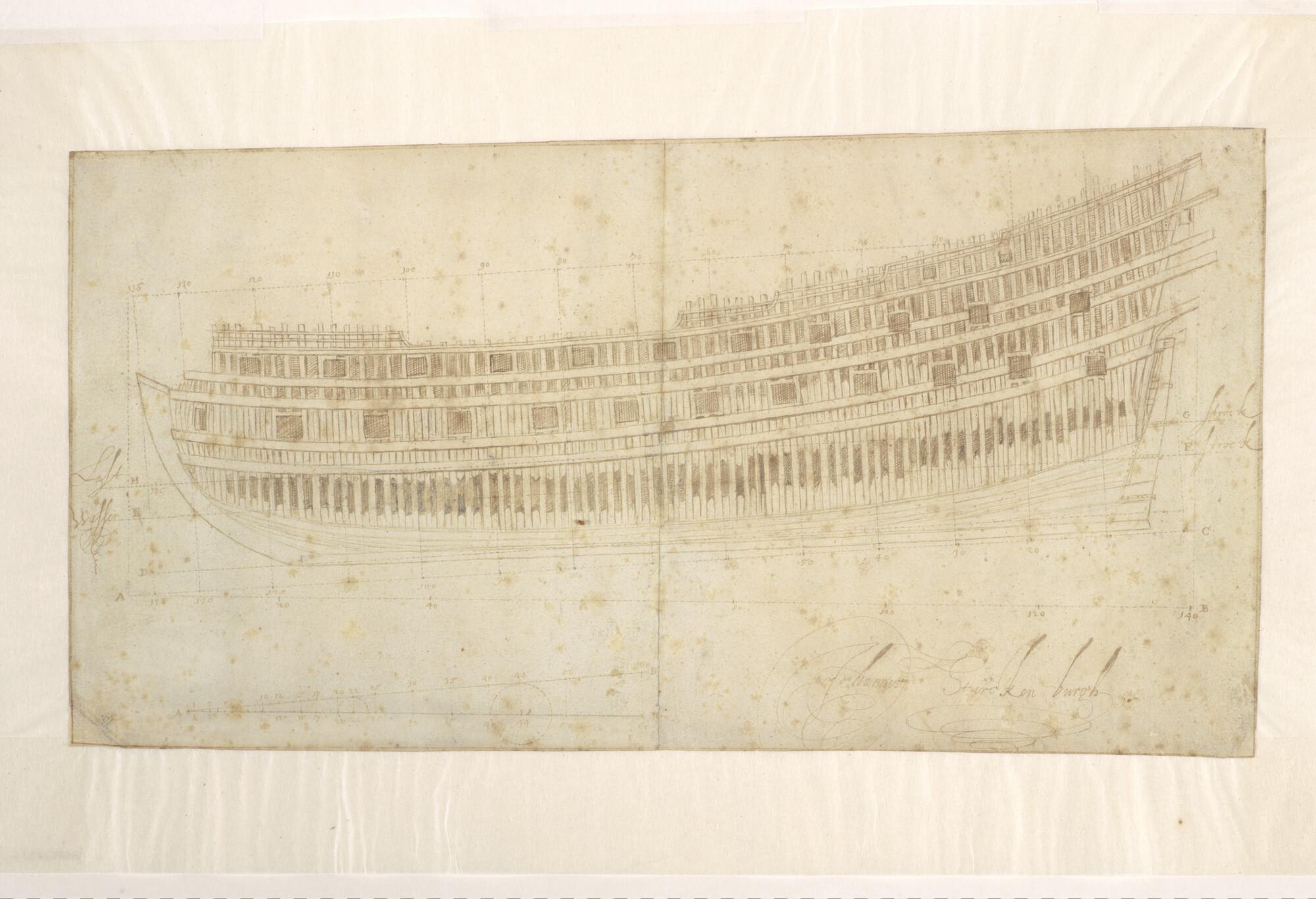 Opengewerkt zijaanzicht van een schip van oorlog van 46 stukken.