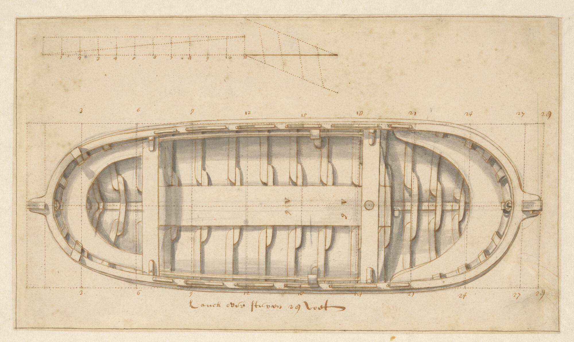 Bovenaanzicht van een chaloup 28 voet, 12 riemen.