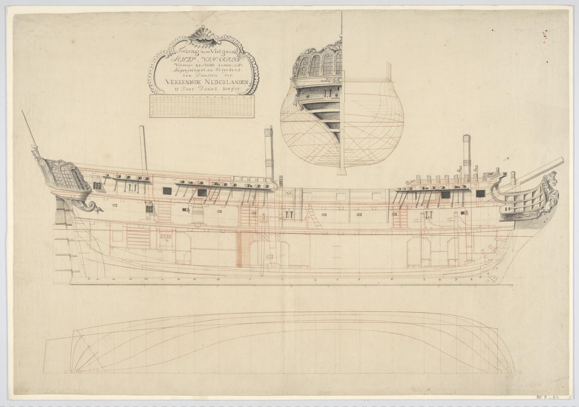 Zijaanzicht, verticale langsdoorsnede, spantenraam, spiegel- en zijgallerij versiering en scheg met gekroonde leeuw van een fregat van 24 stukken, 1777.