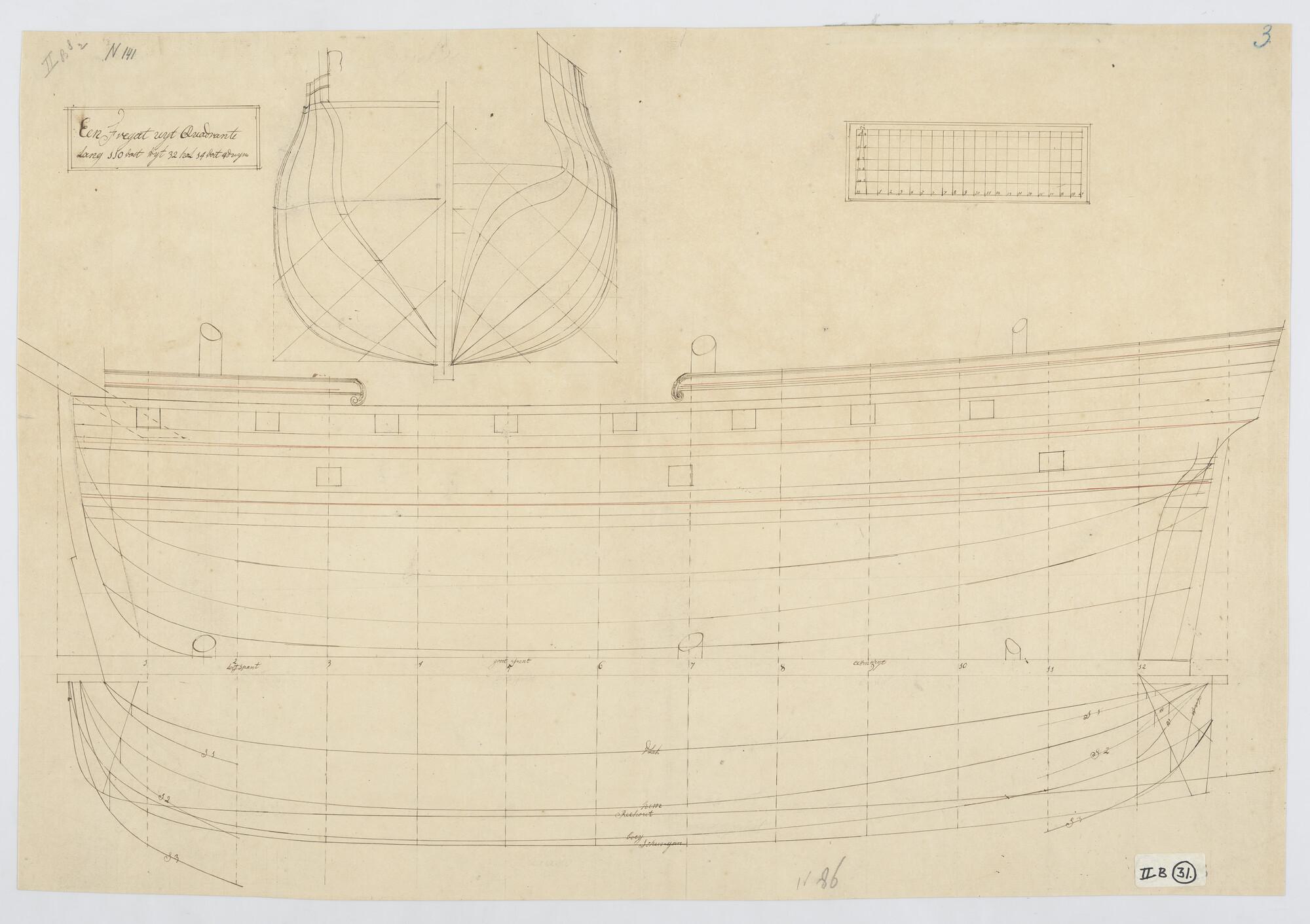Zijaanzicht, spantenraam, senten van een fregat van 22 stukken. Afmetingen van het schip 110 x 32 x 14,4 voet.