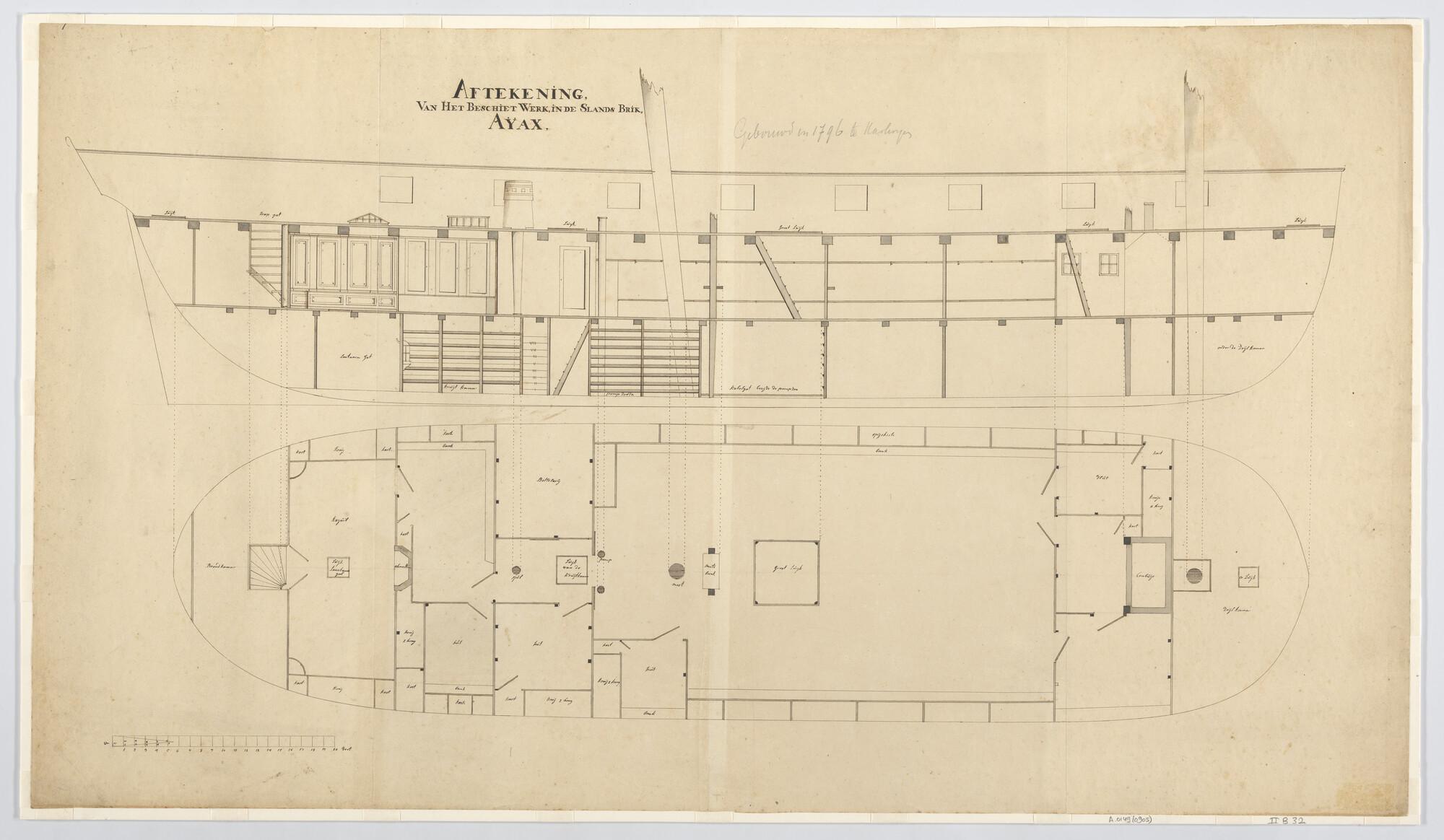 Verticale langsdoorsnede, tussendek van de brik 'Ajax' van 18 stukken 1796. Gebouwd door P. Schuyt Jr. te Harlingen.
