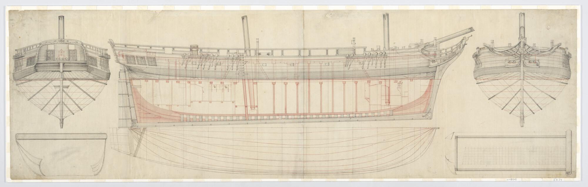 Zijaanzicht, verticale langsdoorsnede, vooraanzicht, achteraanzicht, spantenraam, waterlijnen, senten van de brik 'Echo' van 16 stukken 1796. Gebouwd door P. Schuyt te Harlingen.