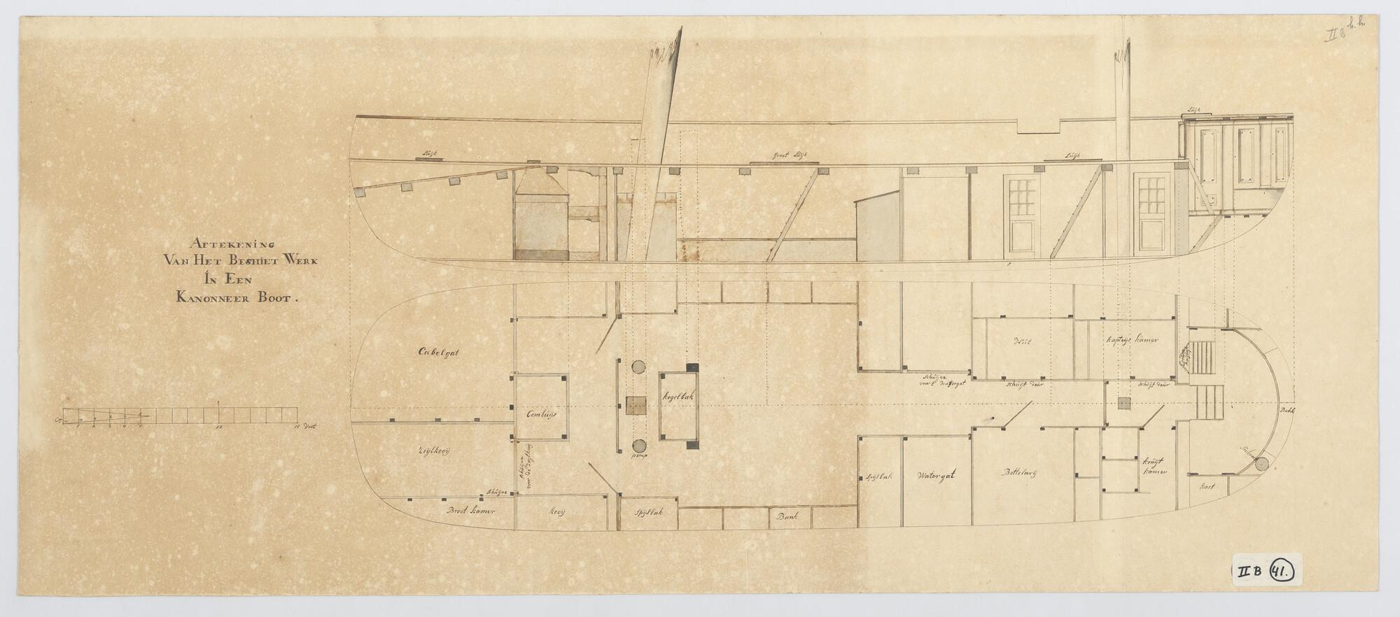 Verticale langsdoorsnede, horizontale langsdoorsnede van een kanonneerboot met twee masten waarvan de voorste achteroverhellend. Afmetingen van het schip 67 x 16 voet.