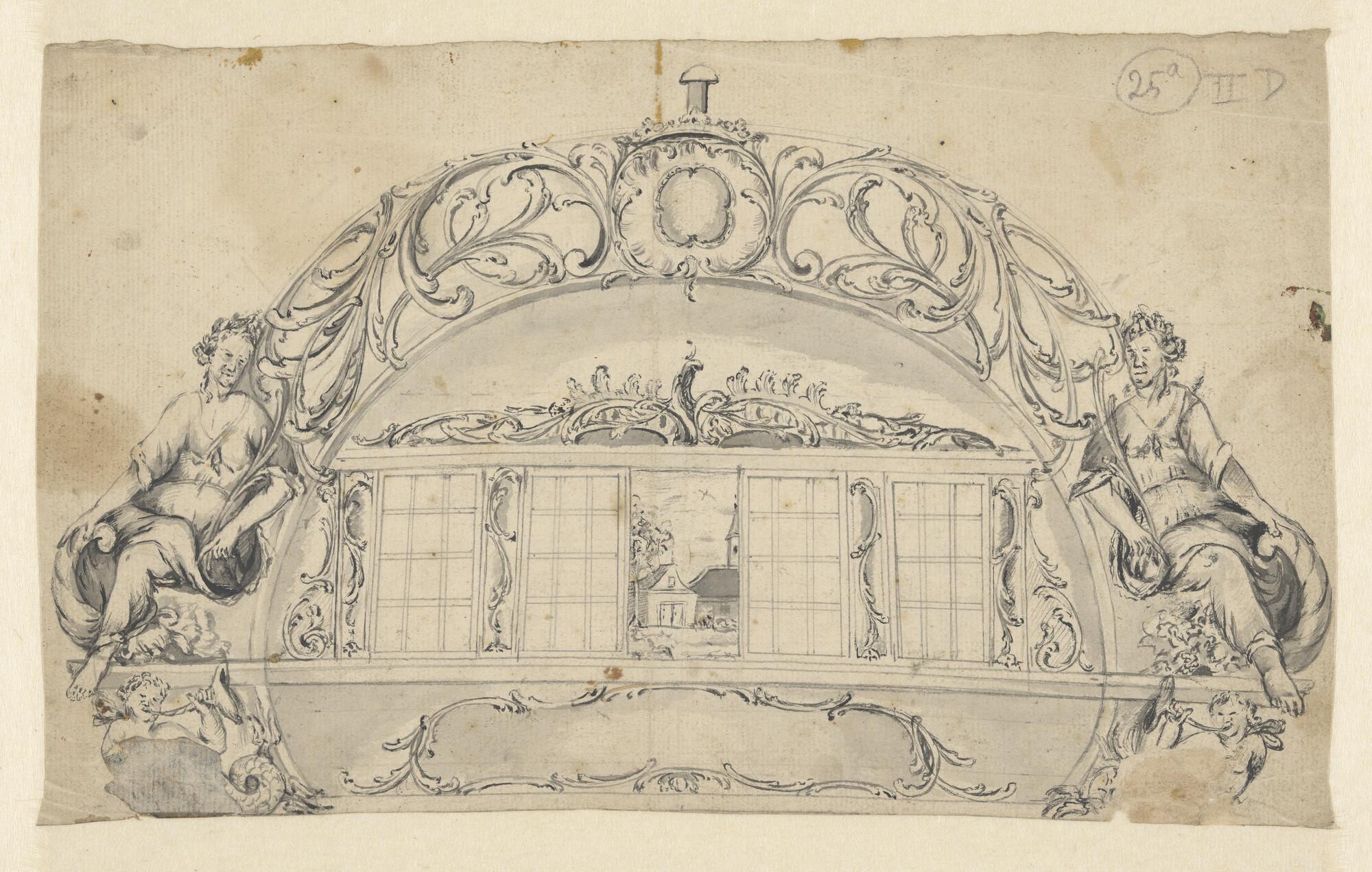 Spiegel met vier ramen waartussen geschilderd paneel met huisjes.