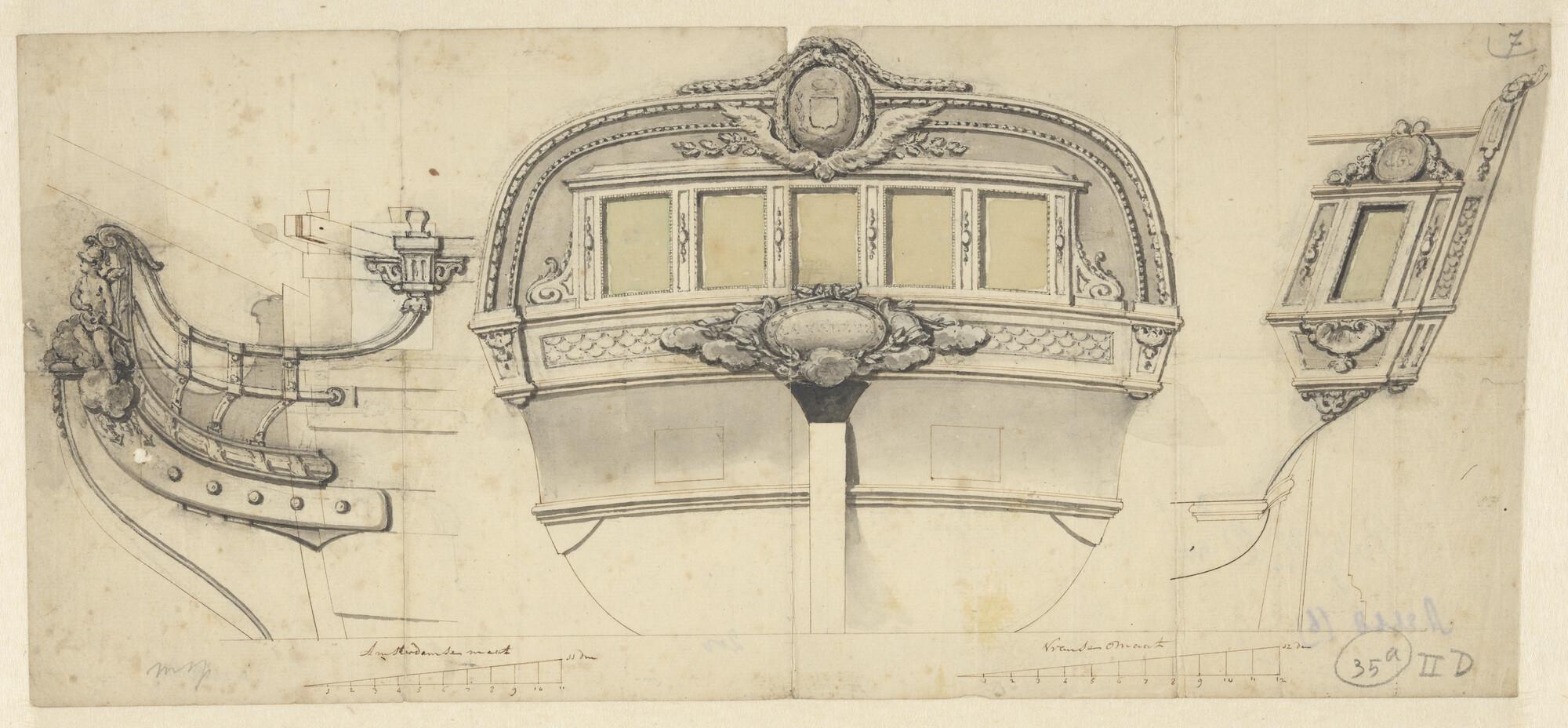 Spiegel- en schegversiering en zijgalerij van een statenjacht.
