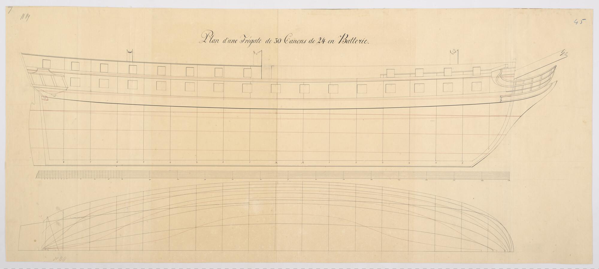 Langsdoorsnede, bovenaanzicht, senten, waterlijn van een Frans fregat van 30 stukken.