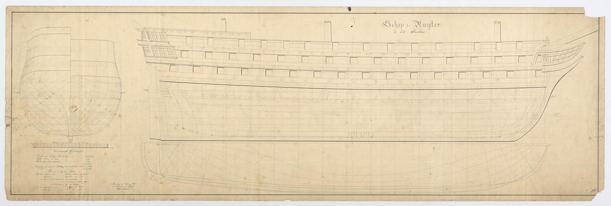 Zijaanzicht met dwarsverband constructie, spantenraam, waterlijnen van het linieschip Zr.Ms. 'De Ruyter' van 74 stukken 1838. Afmetingen 54.16 x 14.30 x 7.35 ellen.