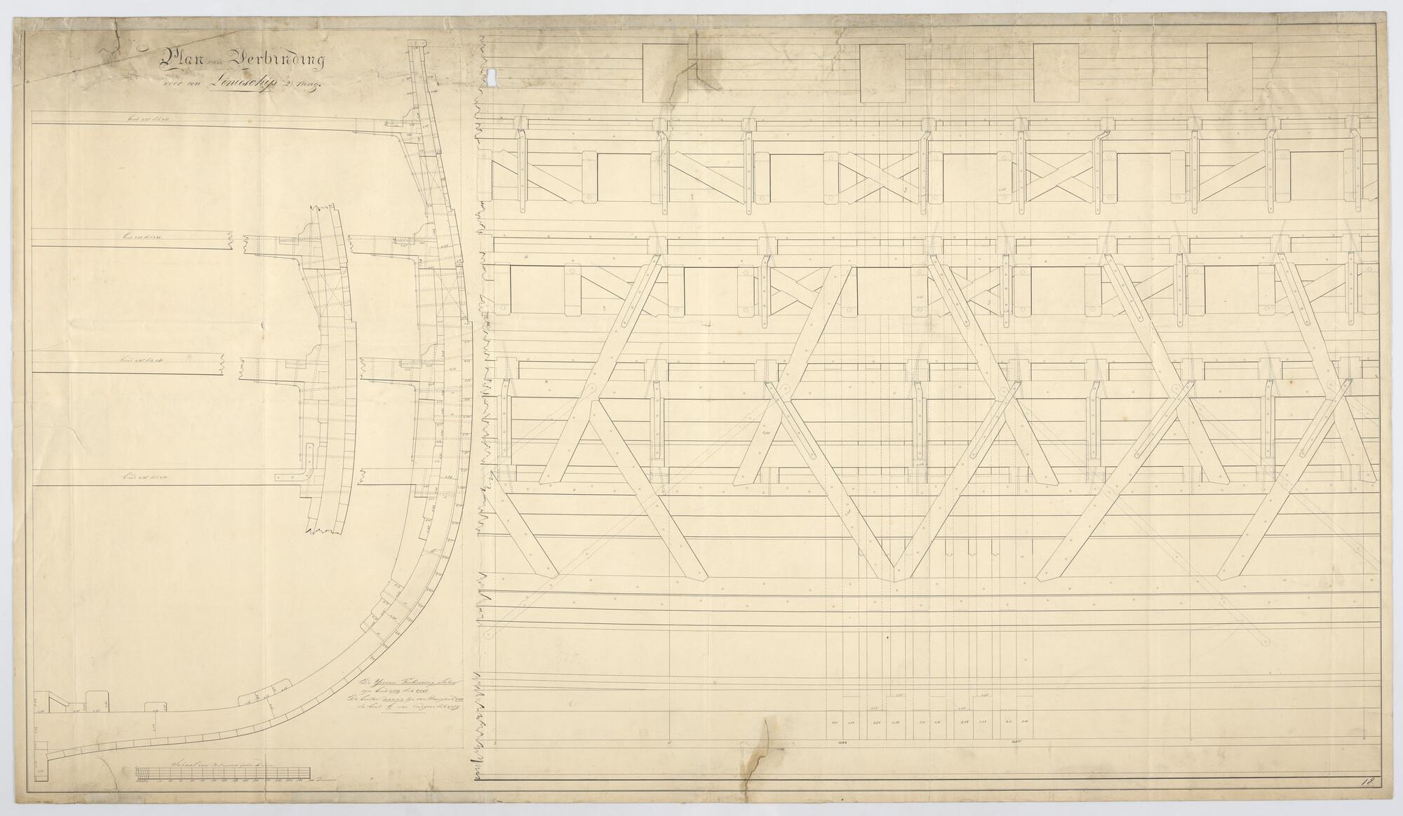 Zijaanzicht met dwarsverbanden en dwarsdoorsnede grootspant van het linieschip Zr.Ms. 'De Ruyter' van 74 stukken.