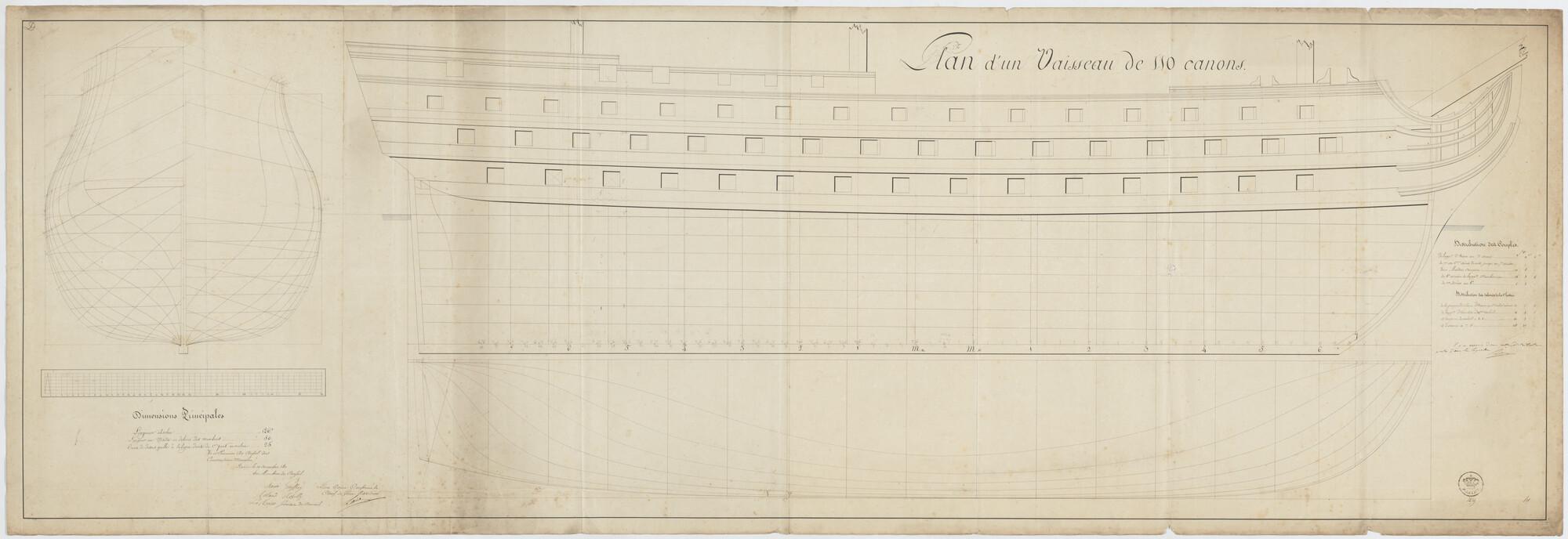 Zijaanzicht, spantenraam, waterlijnen van een fregat van 110 stukken, 1811. Afmetingen 186 x 50 x 25.