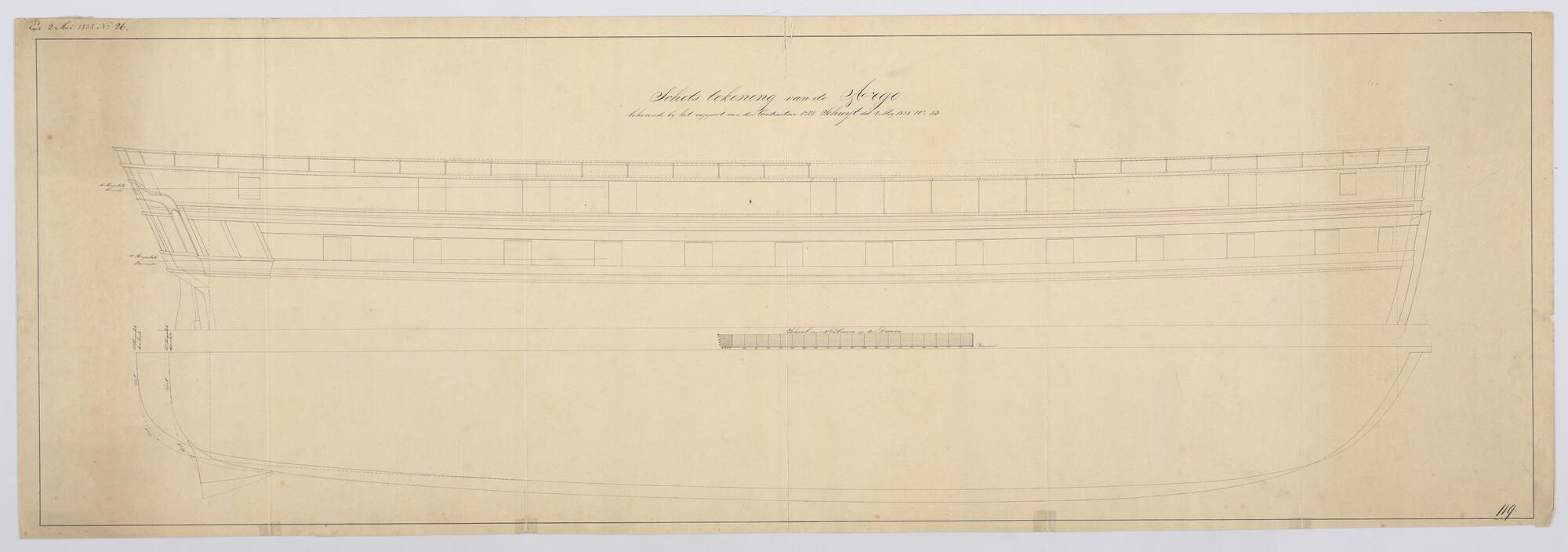 Schets van het zijaanzicht van het korvet van 26 stukken Zr.Ms. 'Argo', 1833.