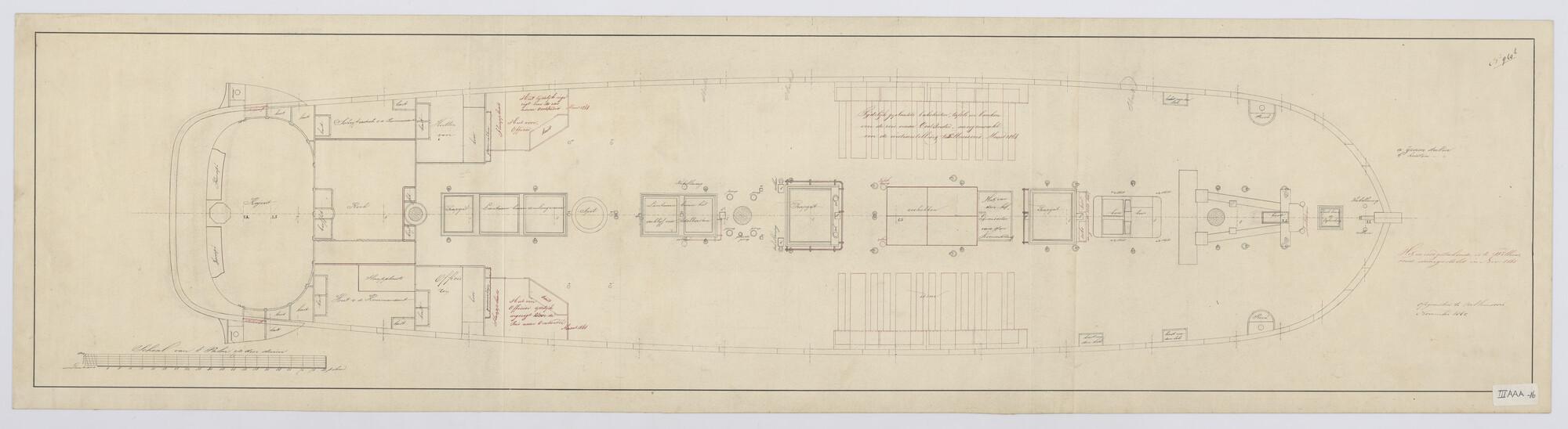 Bovenaanzicht koebrugdek van het korvet Zr.Ms.Van Speyk van 26 stukken, 1838.