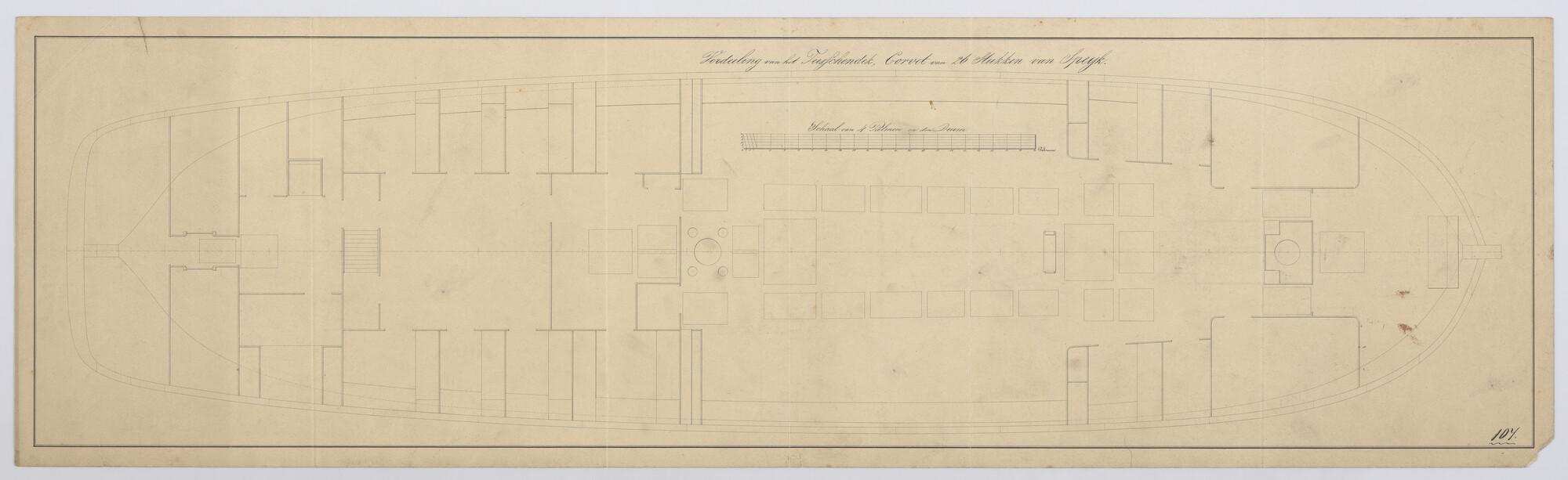 Bovenaanzicht tussendek met indeling van het korvet Zr.Ms. 'Van Speyk' van 26 stukken, 1838.