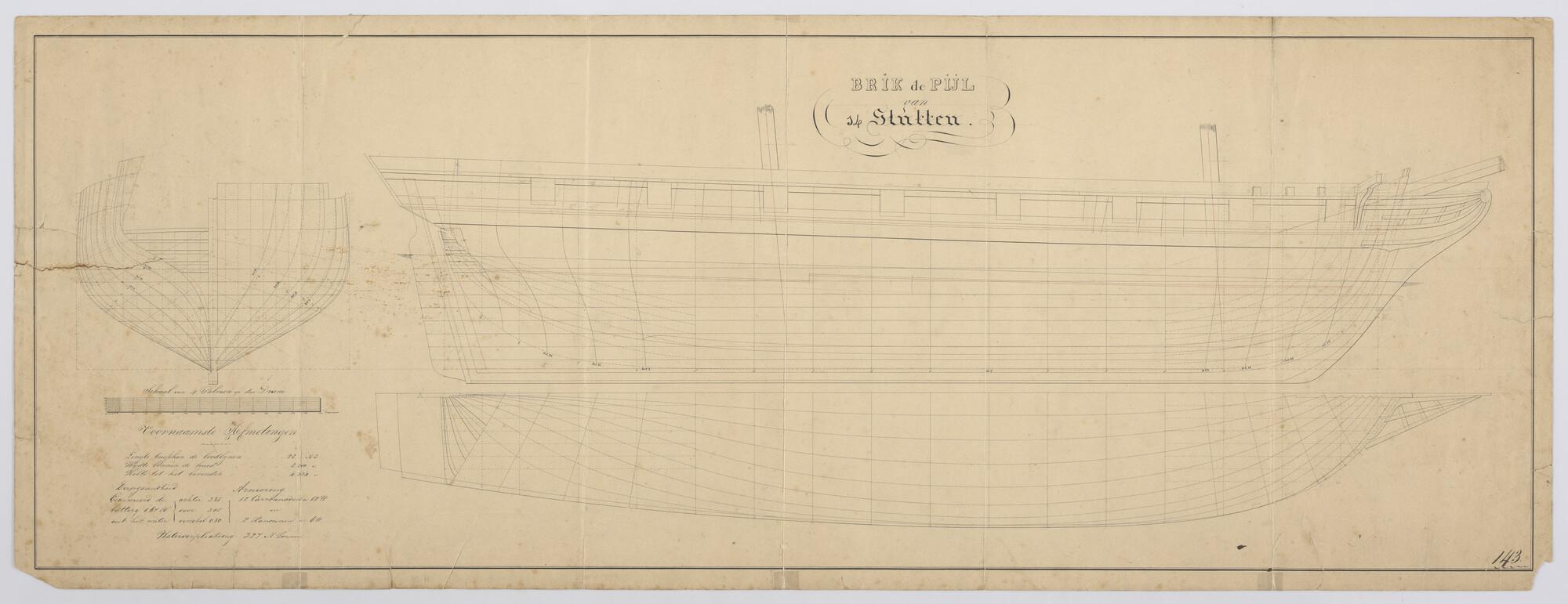 Zij- en bovenaanzicht, waterlijnen, senten, voor- en achteraanzicht spantenraam van de brik Zr.Ms. Pijl van 14 stukken.