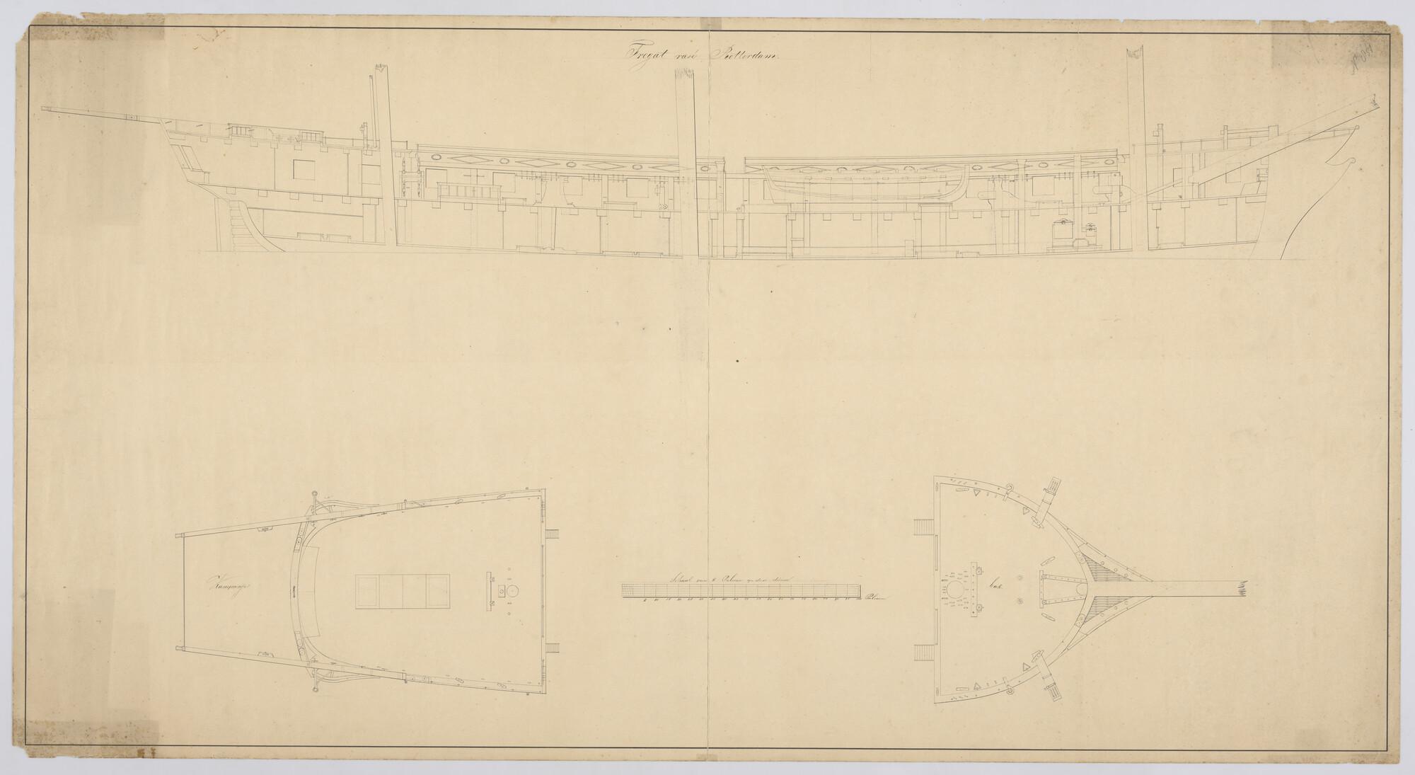 Verticale langsdoorsnede, bak en kampagne van het geraseerd fregat Zr.Ms. Rotterdam van 28 stukken.