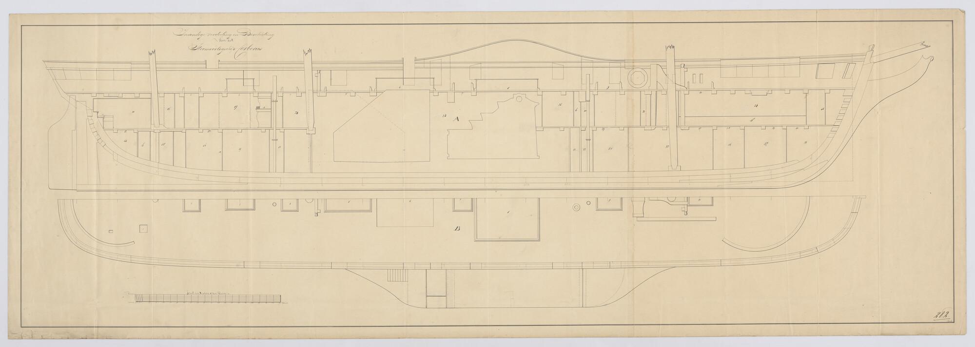 Langsdoorsnede met indeling en bovenaanzicht dek van het raderstoomschip Zr.Ms. 'Cerberus'.