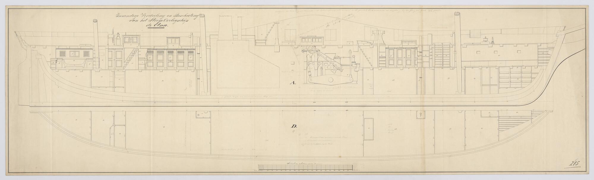 Opengewerkt zijaanzicht en inrichting en bovenaanzicht dek van de stoomraderschepen Zr.Ms. 'Etna', 1837 en 'Hekla', 1838.
