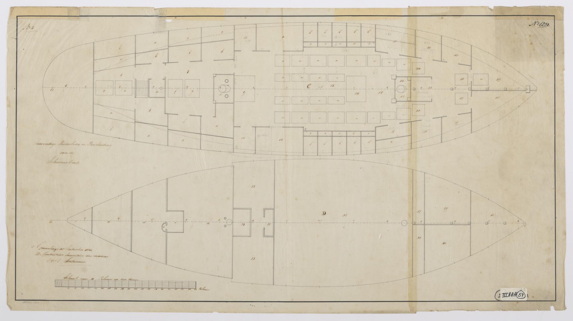 Indelingsplan en inrichting dekken van een schoenerbrik van vijf stukken.