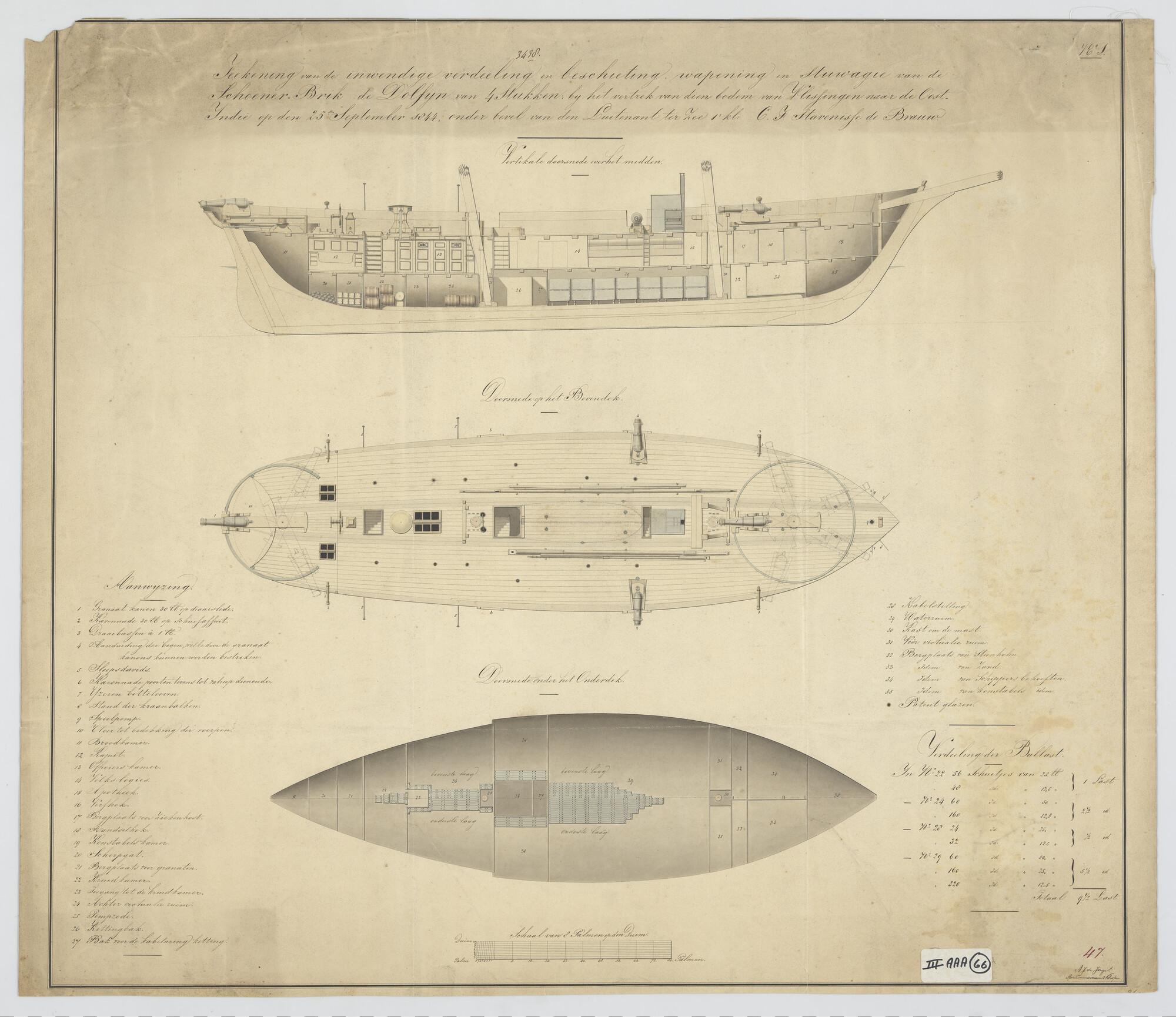 Opengewerkt zijaanzicht, dekindeling en inrichting benedendek van de schoenerbrik Zr.Ms. 'Dolfijn' van 4 stukken, 1844.