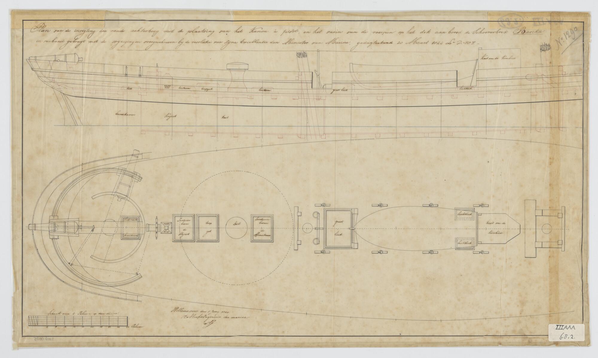 Zijaanzicht en dekplan voor de verbouwing van het achterschip met ronde achterboeg voor de plaatsing van het kanon à pivot van de schoenerbrik Zr.Ms. Banka