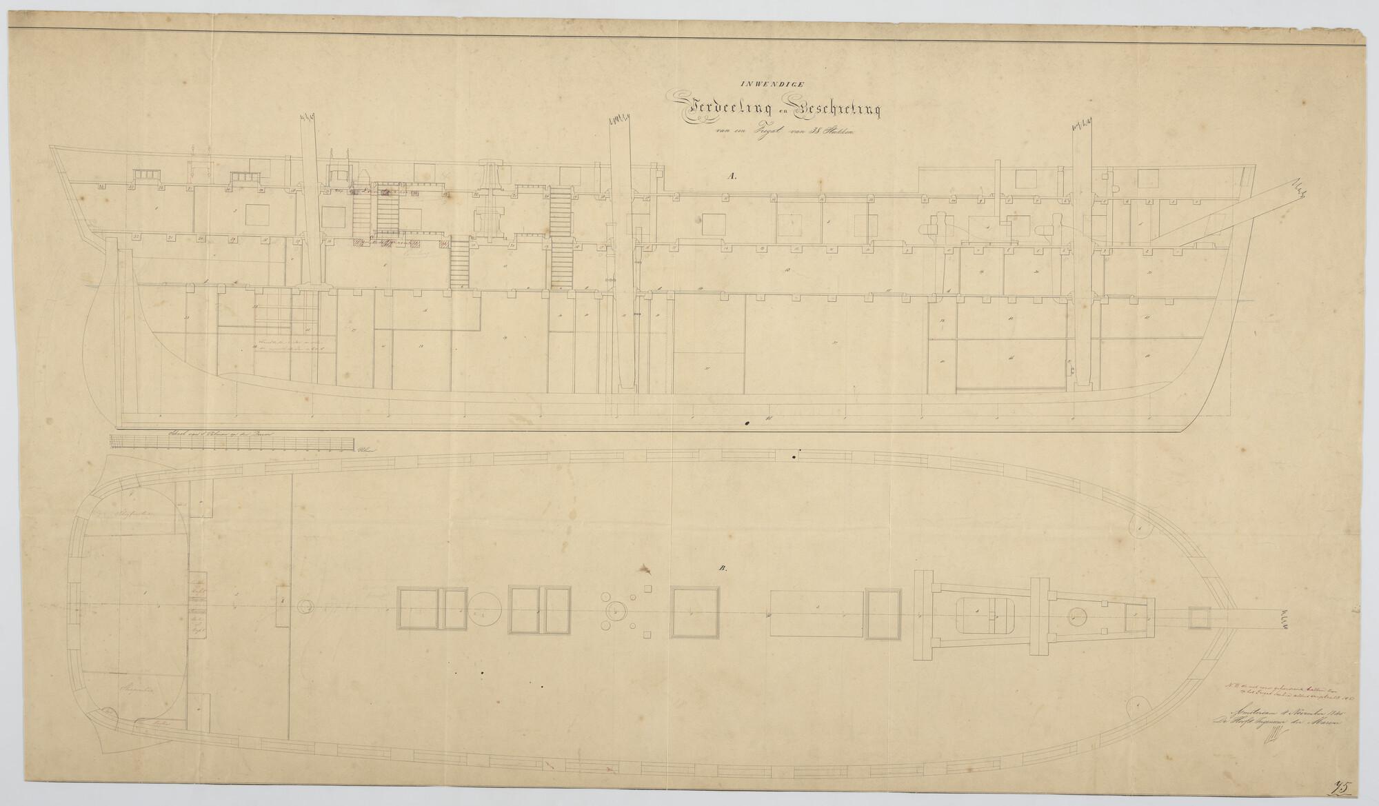 Verticale langsdoorsnede, en bovendek van een fregat van 38 stukken.
