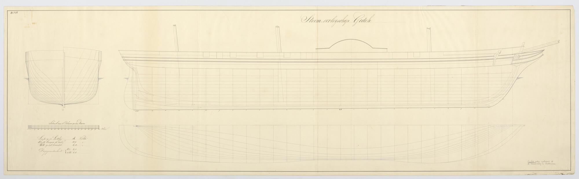 Lijnenplan, spantenraam, zij- en bovenaanzicht van het stoomraderschip Zr.Ms. ' Gedeh', 1850.