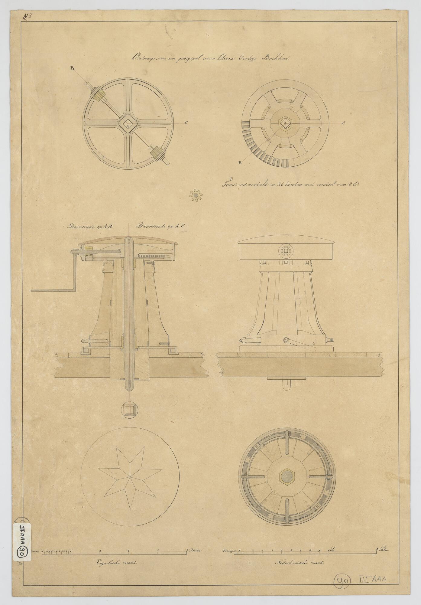 Opengewerkte zijaanzichten en bovenaanzichten van een gangspil voor kleine oorlogsbrikken.
