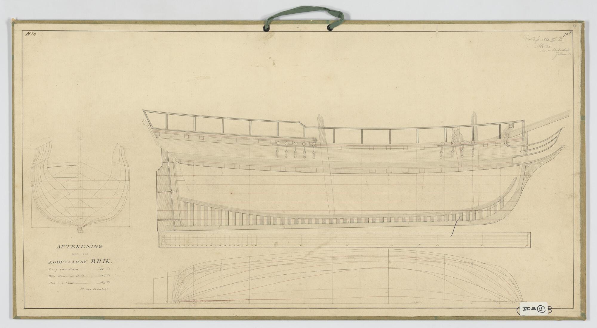 Zijaanzicht, spantenraam, waterlijnen, senten van een koopvaardijbrik. afmetingen van het schip 80 x 21,5 x 10,5 voet.