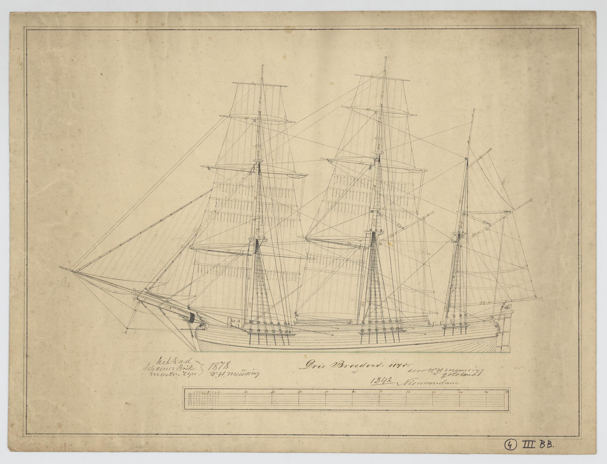 Zijaanzicht met tuig en zeilplan van de driemastgaljoot 'Drie Gebroeders'. Lengte van het schip 117 voet.