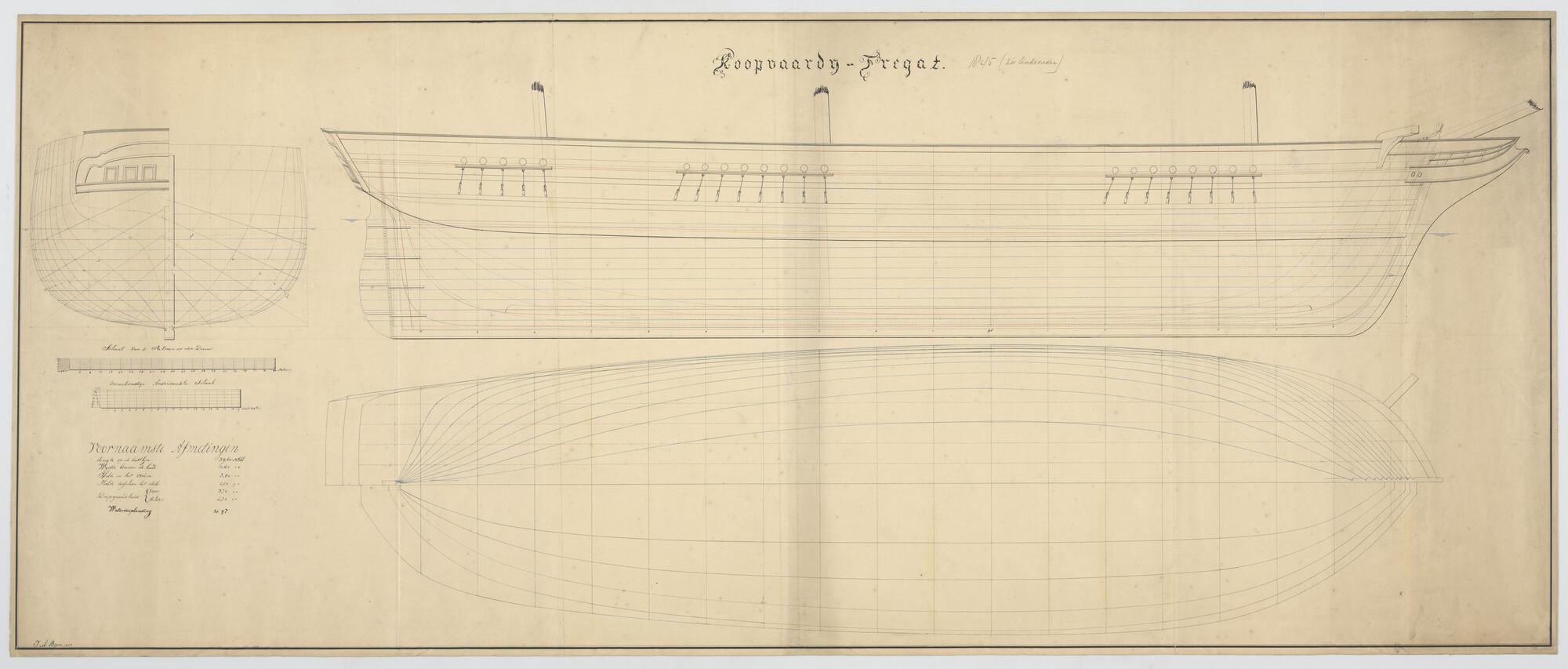 Zijaanzicht, spantenraam, met spiegel, waterlijnen, verticalen, senten van een koopvaardijfregat. Afmetingen 39.60 x 10.80 x 5.70 ellen.