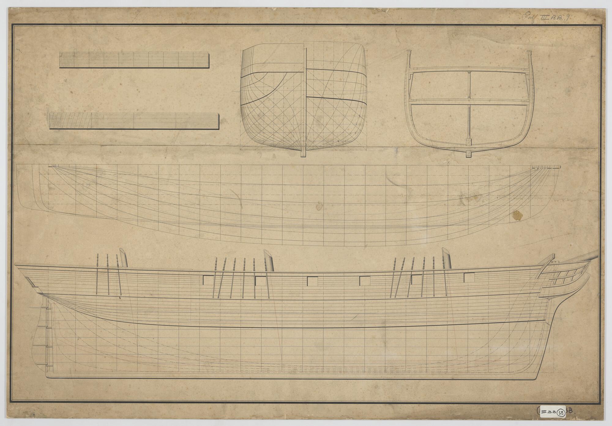 Zijaanzicht, spantenraam, waterlijnen, verticalen, senten, grootspant van een barkschip.