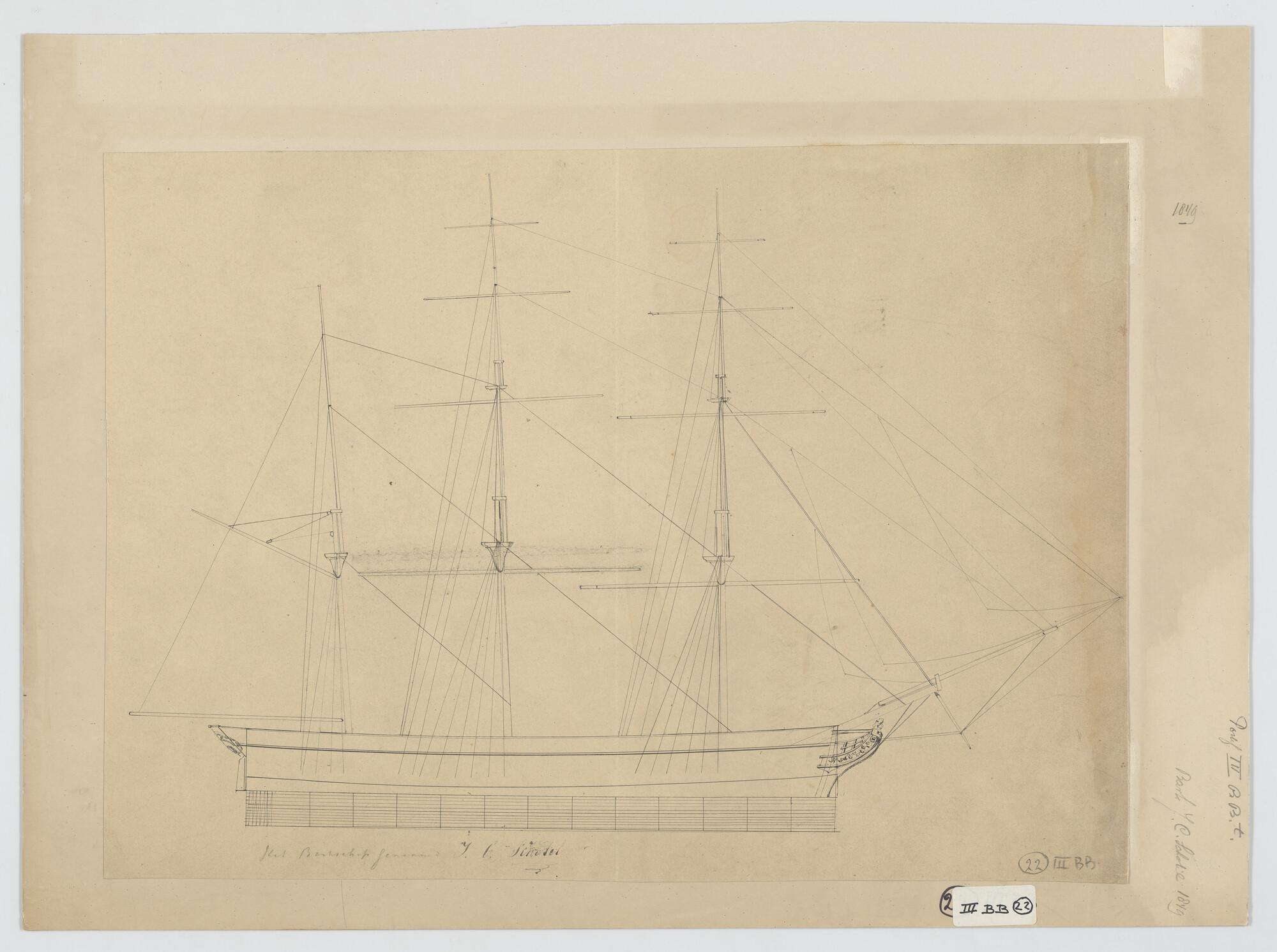 Zijaanzicht met tuigplan van het barkschip 'J.C. Schotel'. Afmetingen van het schip 37.20 x 7.02 x 3.29 ellen.