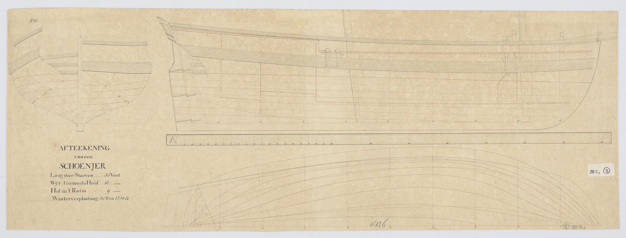 Lijnenplan, vooraanzicht, zijaanzicht, achteraanzicht van een schoener. Afmetingen 55 x 18 x 9 voet.