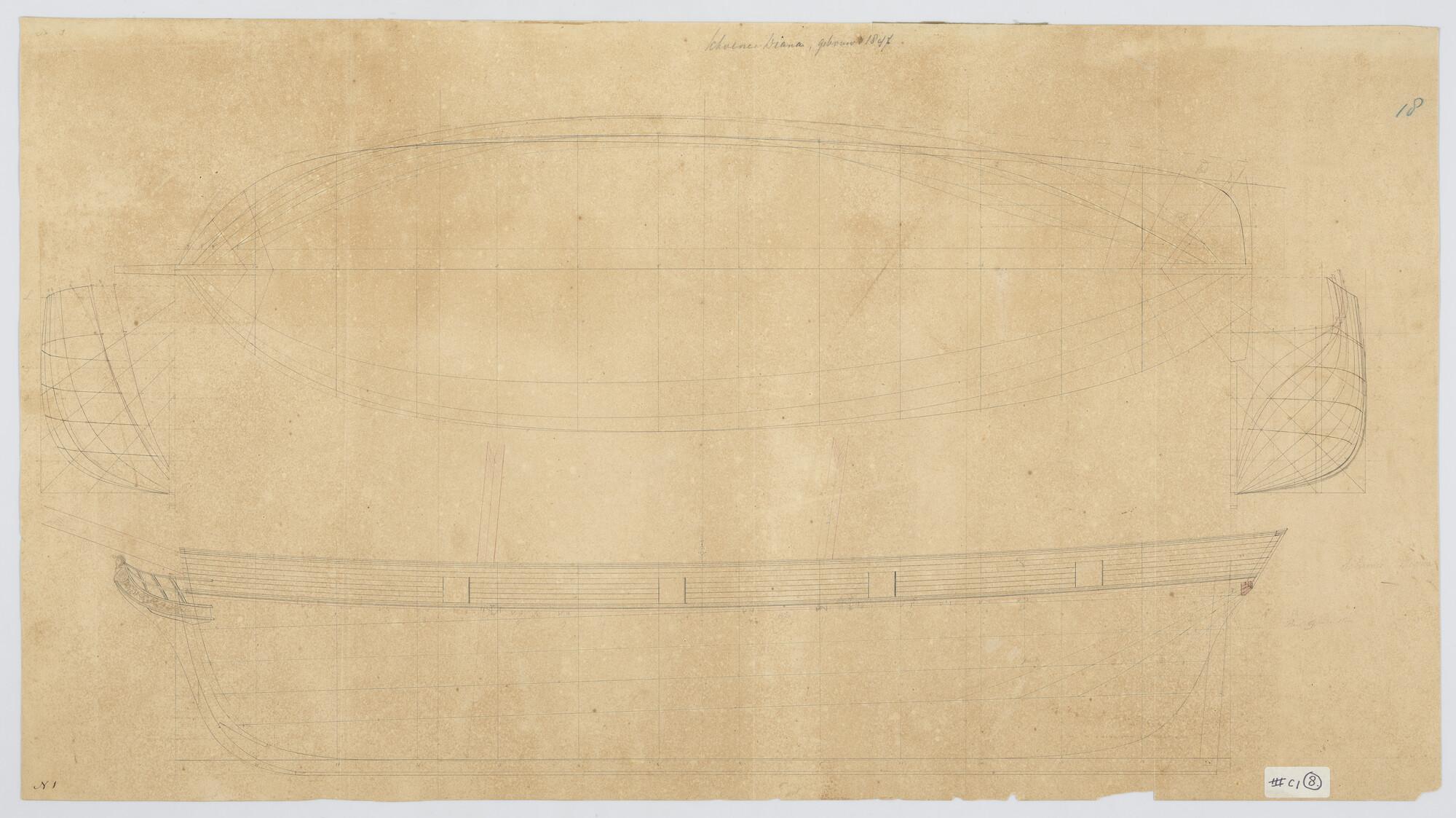 Lijnenplan, spantenraam, voor- en achteraanzicht, zijaanzicht van de schoener 'Diana', 1847.