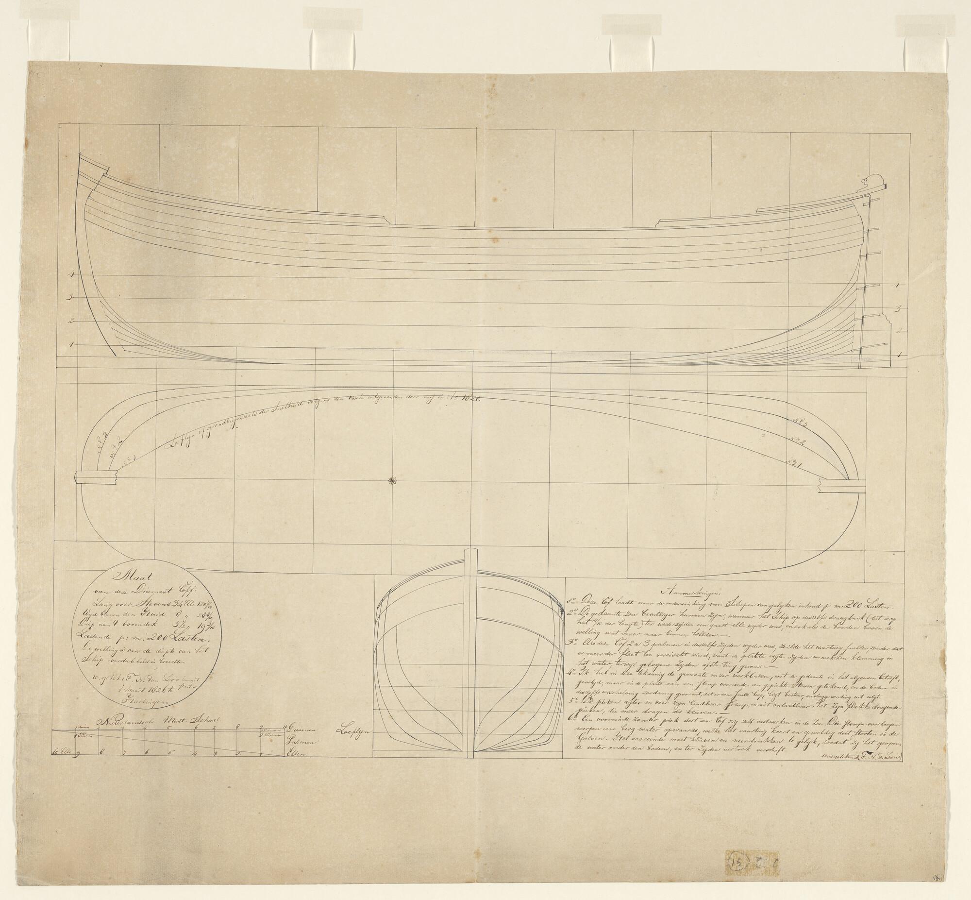 Zijaanzicht, bovenaanzicht, vooraanzicht, achteraanzicht, met waterlijnen van een driemast kofschip. Afmetingen 34 x 8 x 3½ el.