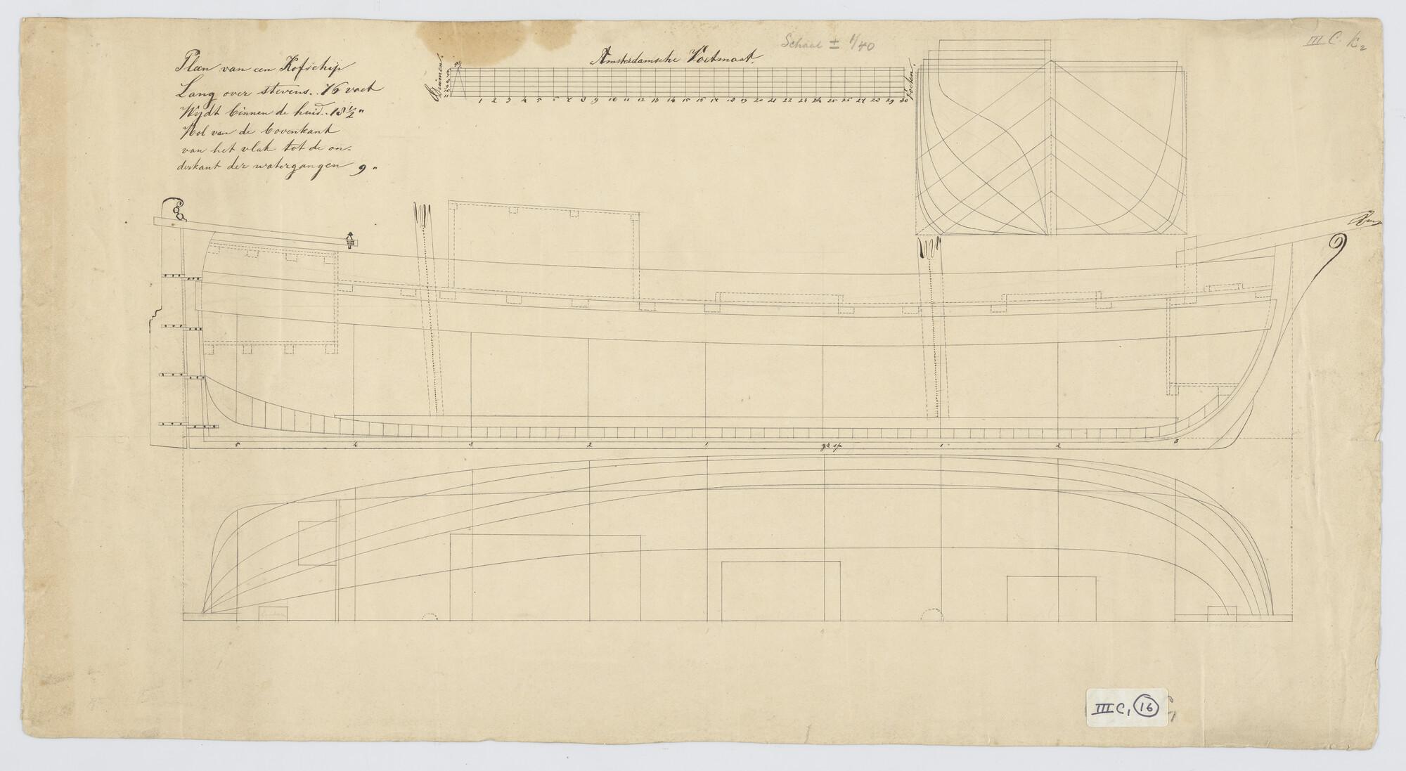 Spantenraam, waterlijnen, senten, zijaanzicht, bovenaanzicht, vooraanzicht, achteraanzicht van een kofschip. Afmetingen 76 x 18½ x 9 voet.