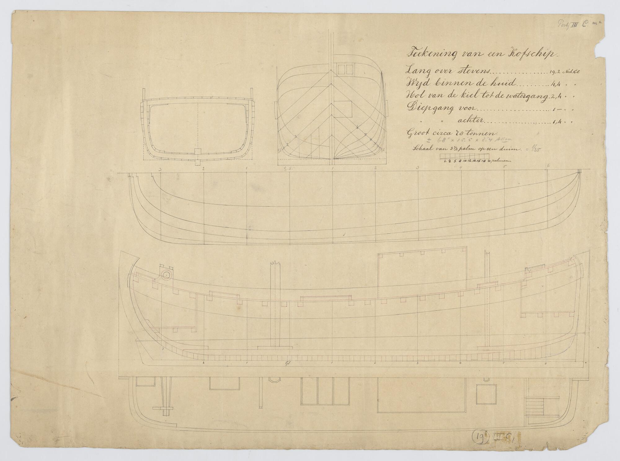 Zijaanzicht, bovenaanzicht, grootspant, waterlijnen, spantenraam, senten van een kofschip. Lengte 19.2 ellen.
