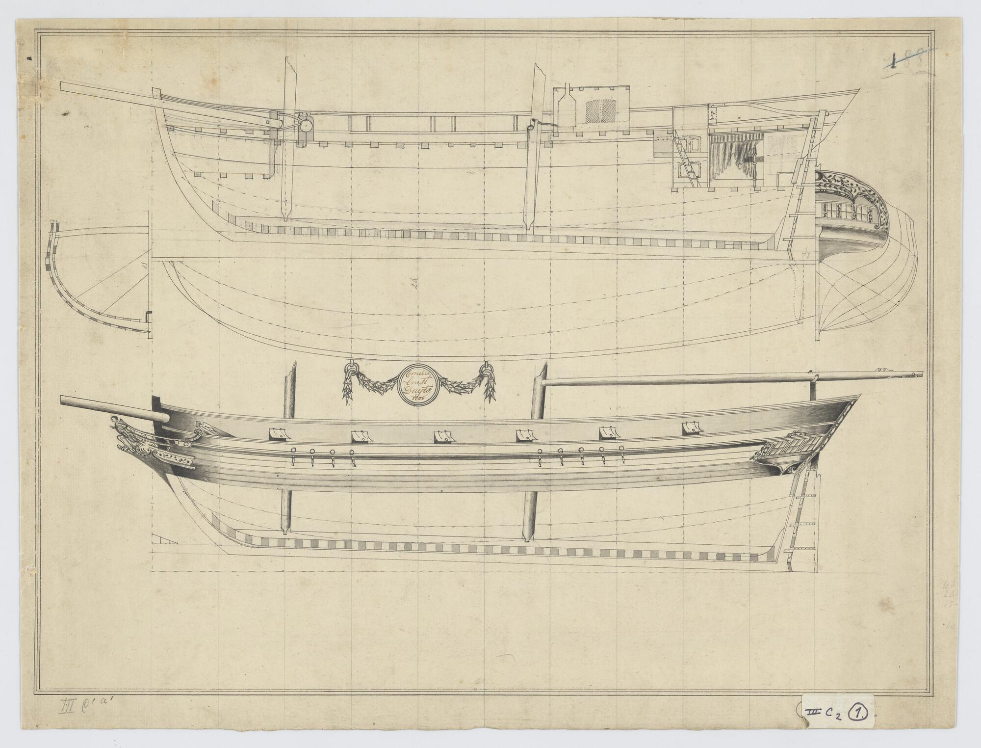 Verticale langsdoorsnede, zijaanzicht, achteraanzicht, spantenraam, grootspant, senten, van een schoonderschip.