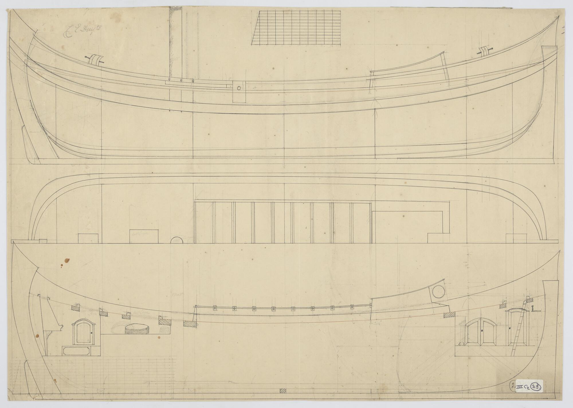 Zijaanzicht, bovenaanzicht, verticale langsdoorsnede van een beurtschip.