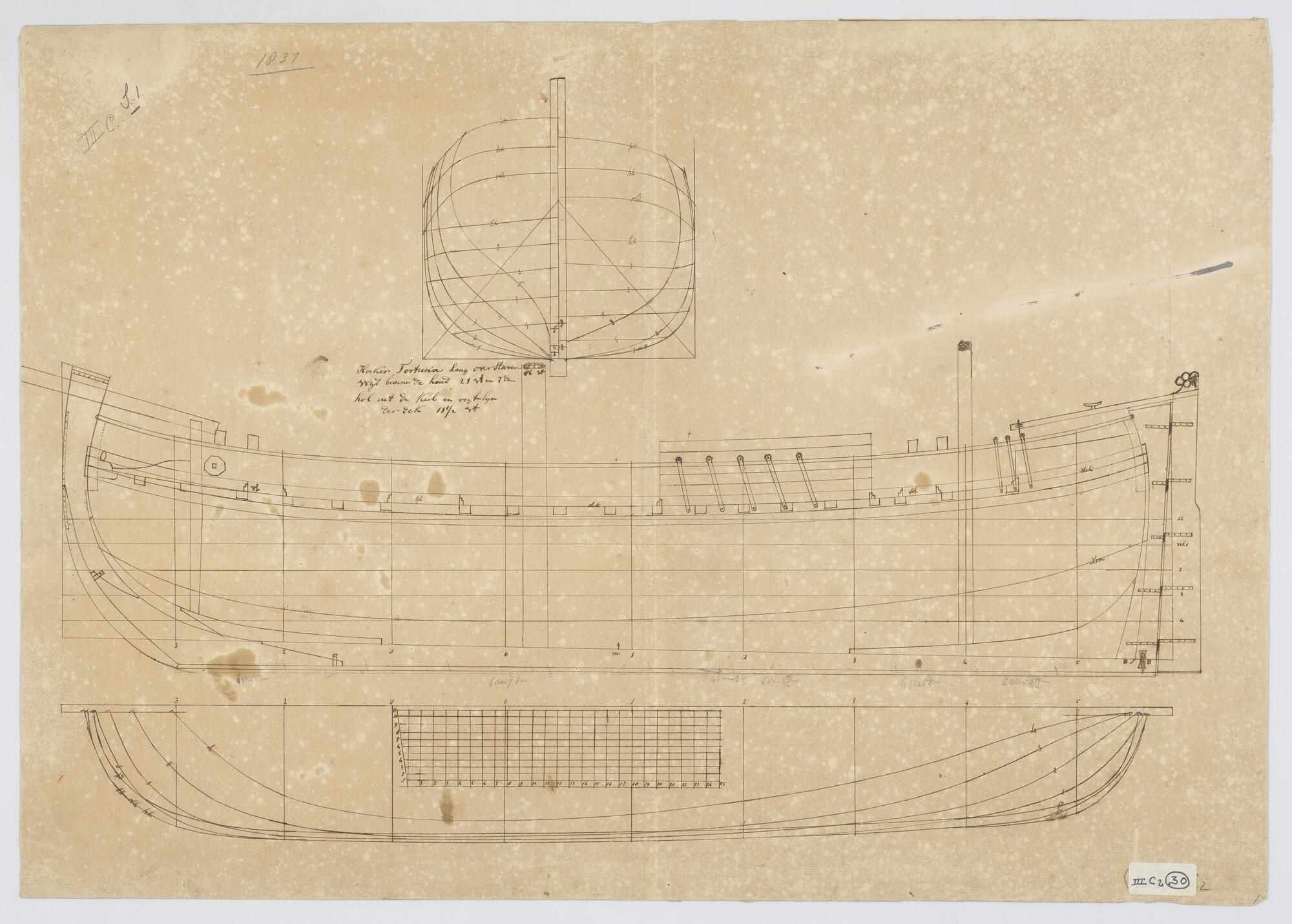Zijaanzicht, spantenraam, senten, waterlijnen van de driemast hoeker 'Fortuna'. Lengte 86 x 21.7 x 11½ voeten