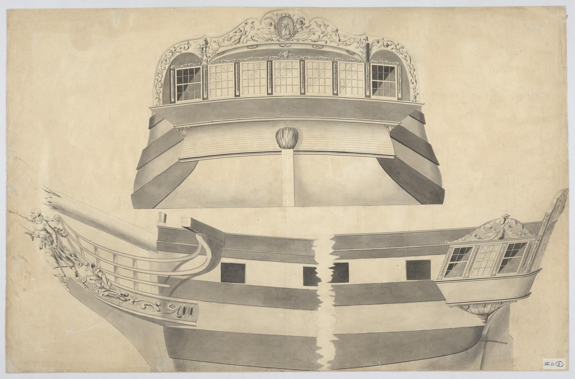 Spiegel- en schegversiering van het fregat 'Kenau Hasselaar': spiegel met 7 ramen waarboven een ramskop en in de bovenlijst een medaillon met Kenau. De schegversiering is Kenau en een van haar medestandsters te zien.