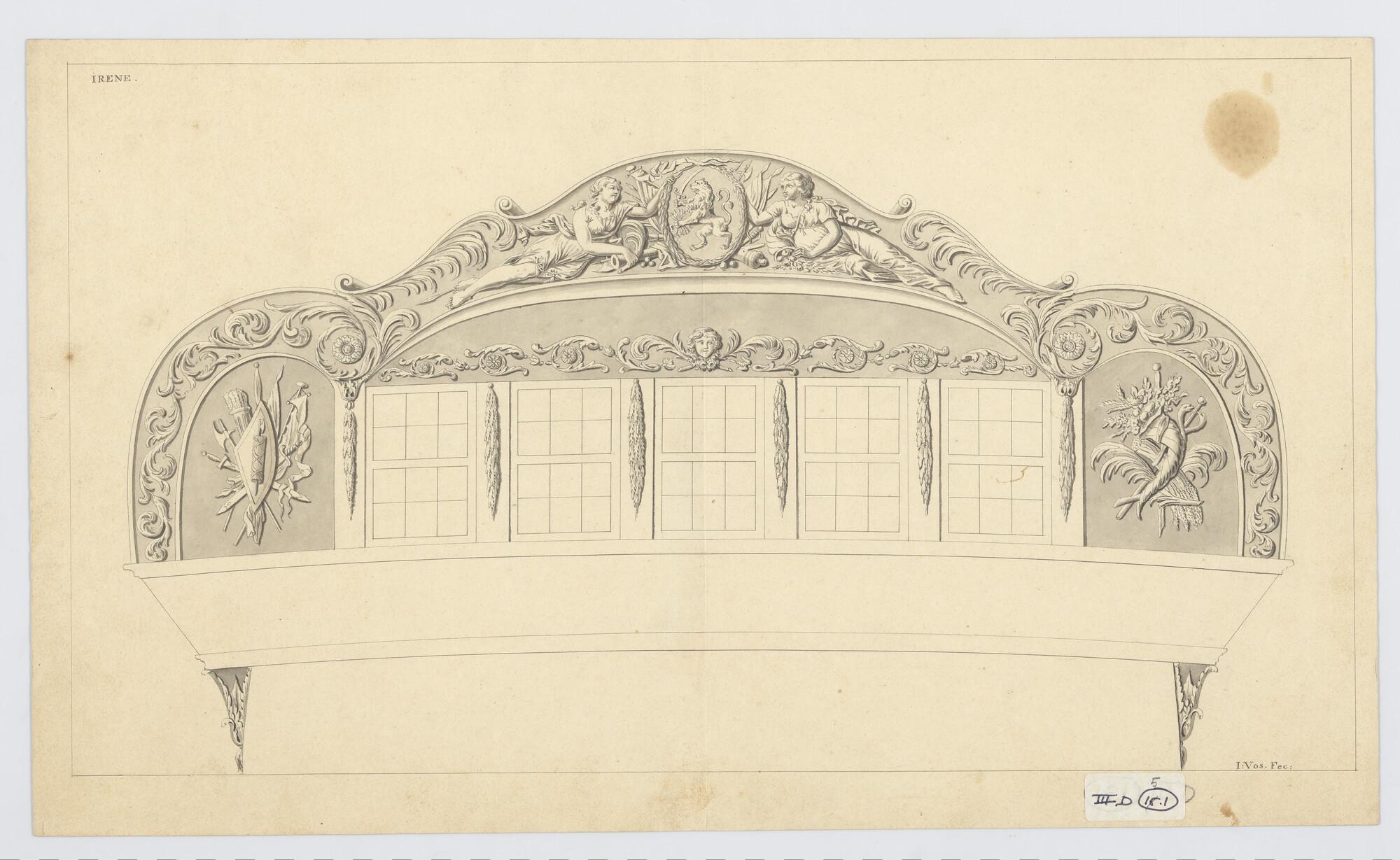 Ontwerp voor de spiegel met vijf ramen van de brik 'Irene'. Boven de ramen is een in medaillon klimmende leeuw met zwaard en pijlenbundel en 2 liggende vrouwenfiguren als wapendraagsters