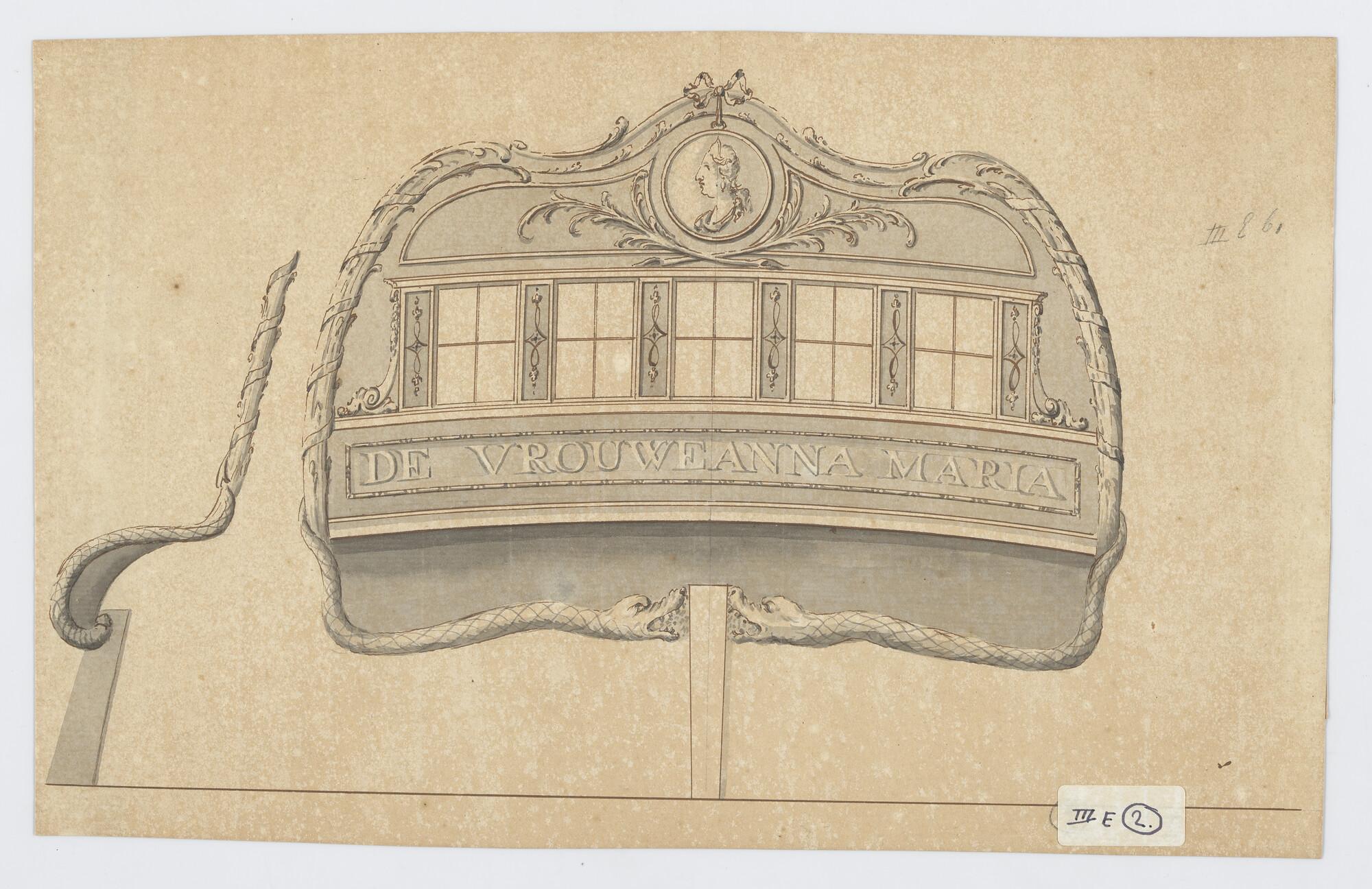 Spiegelversiering van 'De Vrouwe Anna Maria'. Ter weerszijden van het roer twee zeeslangen, bovenaan de spiegel in een ovaal een vrouwenportret.