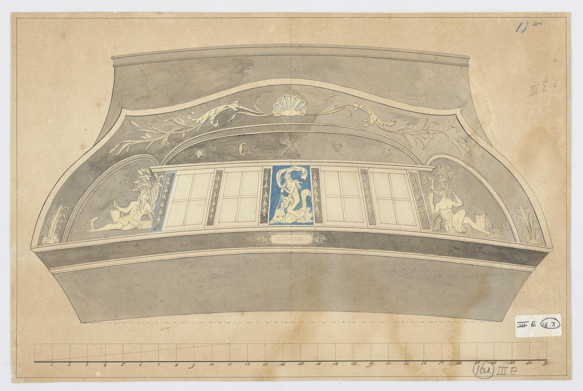 Een van de drie ontwerpen van spiegelversiering van het koopvaardijfregat 'Oud Alblas'.
