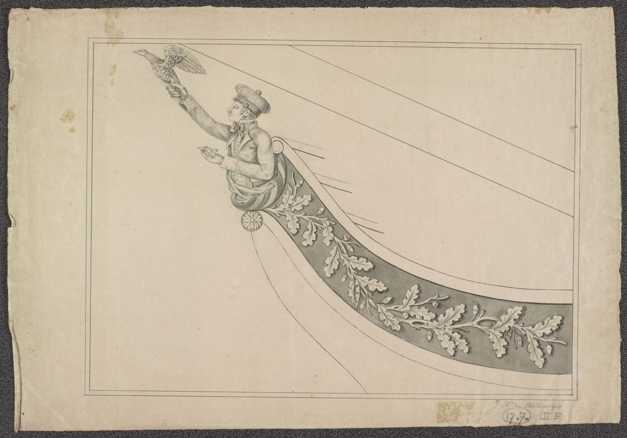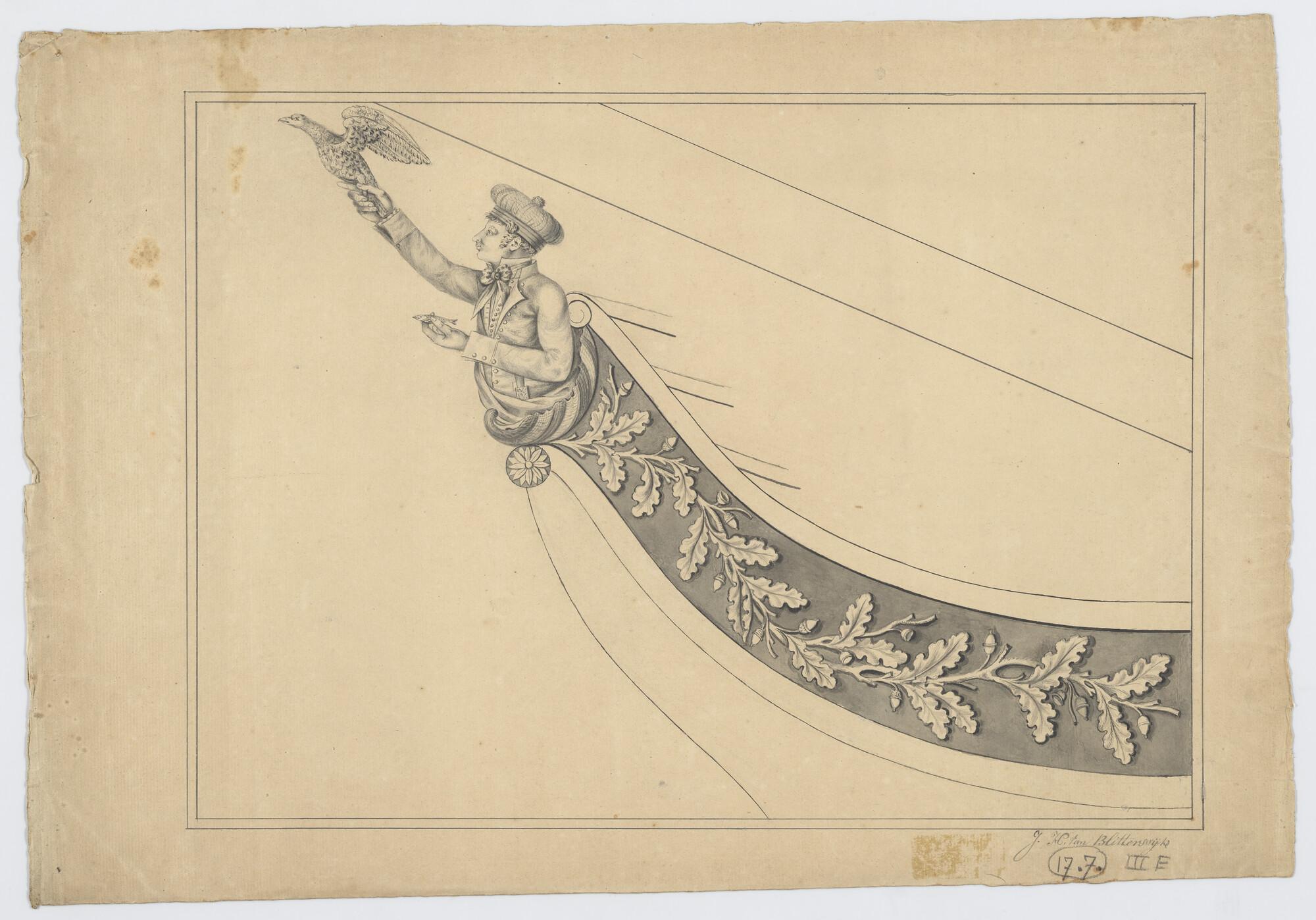 Ontwerp van een schegbeeld voor een onbekend schip met het borstbeeld van een jonge man met gepompoende muts, adelaar in opgeheven rechterhand en visje in linkerhand, komend uit schelp en eikenloofrank.