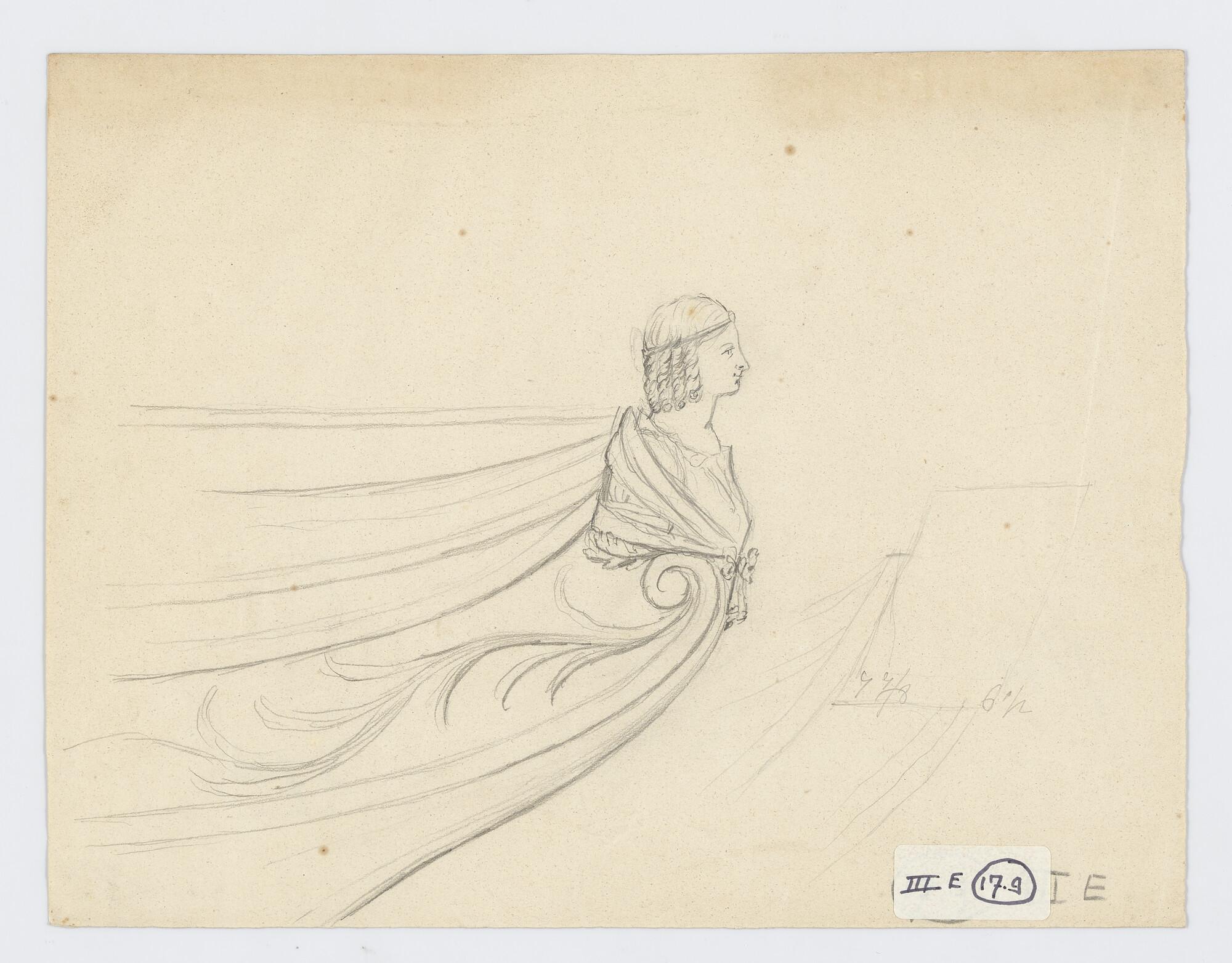 Ontwerp van een schegbeeld voor een onbekend schip met een vrouw met pijpekrullen.