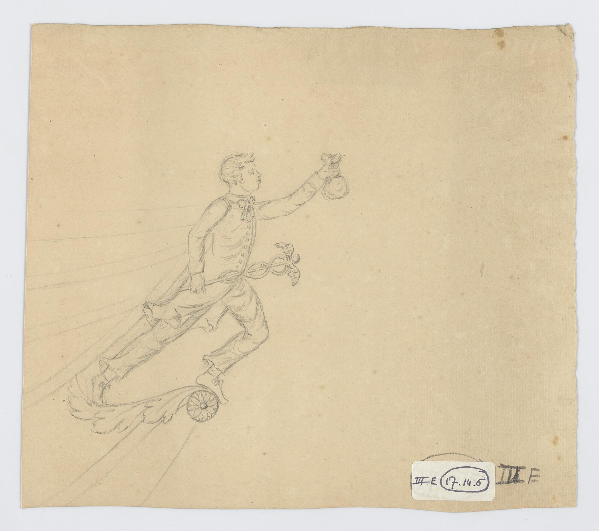 Ontwerp van een schegbeeld voor een onbekend schip met een jongensfiguur.