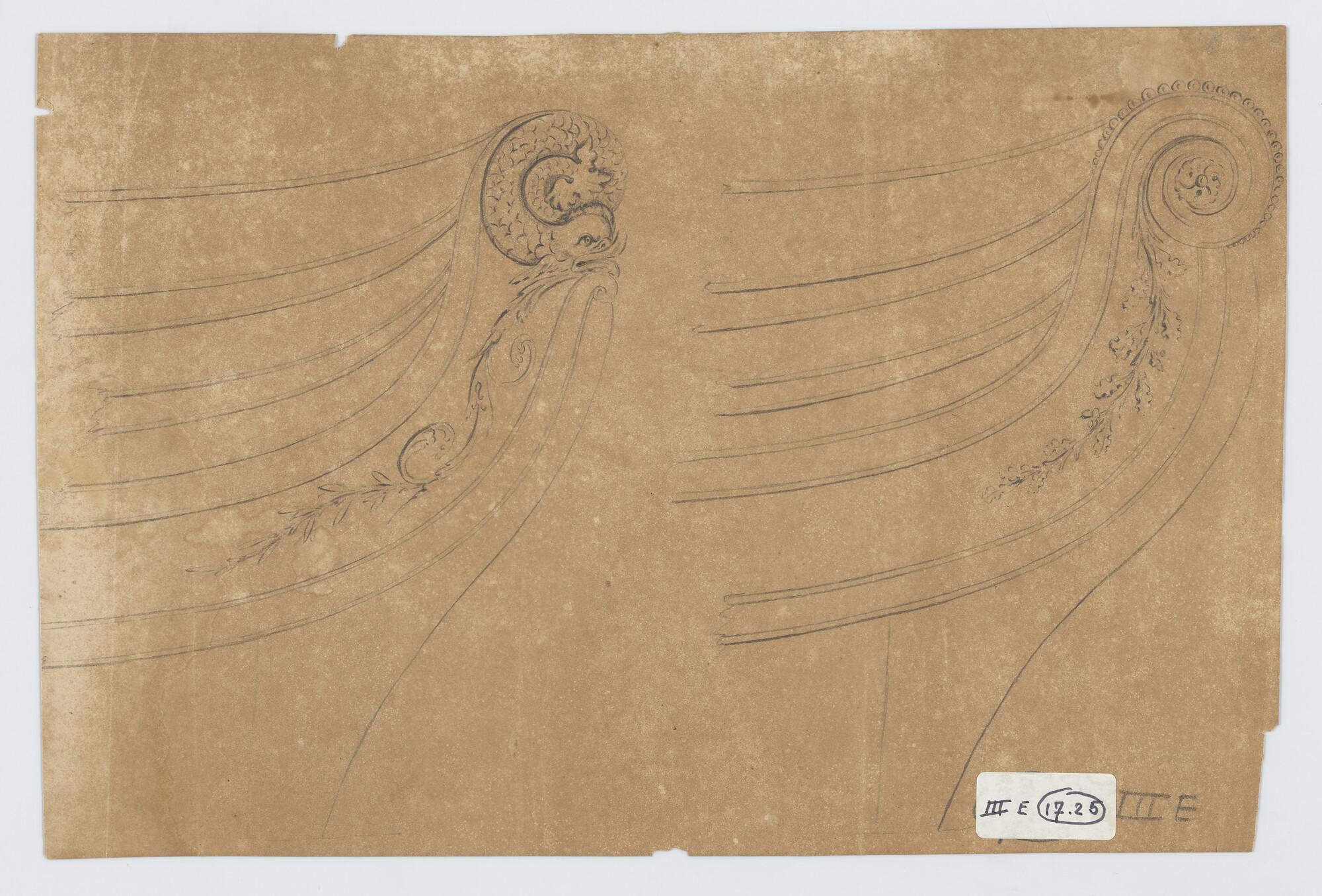 Twee schegontwerpen voor een onbekend schip met dolfijn en met een geparelde krul en eikenloof.
