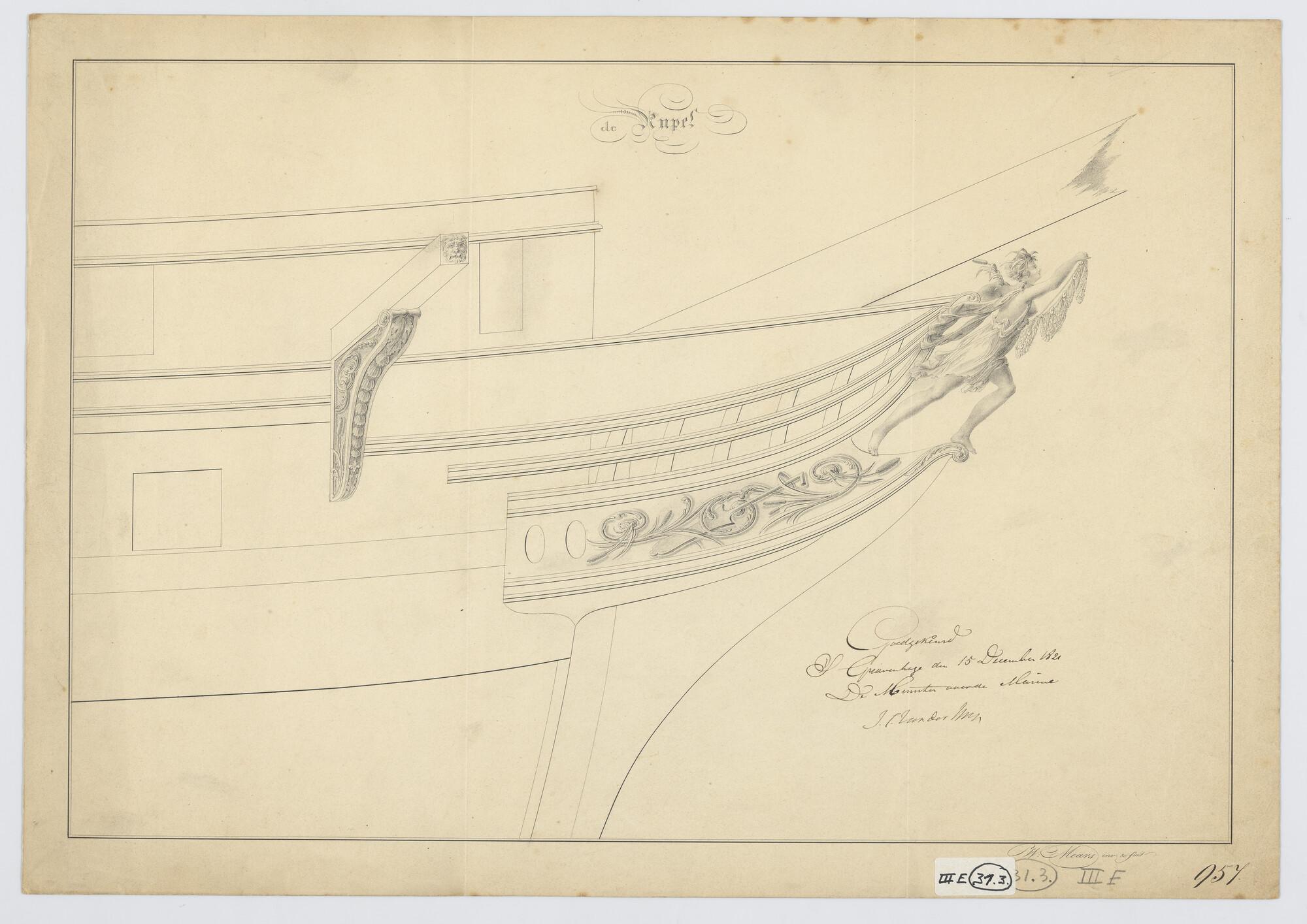 Schegversiering met jonge vrouw, in rechter opgeheven hand een net, inlinker opgeheven hand rietstengels van het fregat Zr.Ms. 'Rupel' van 44 stukken.