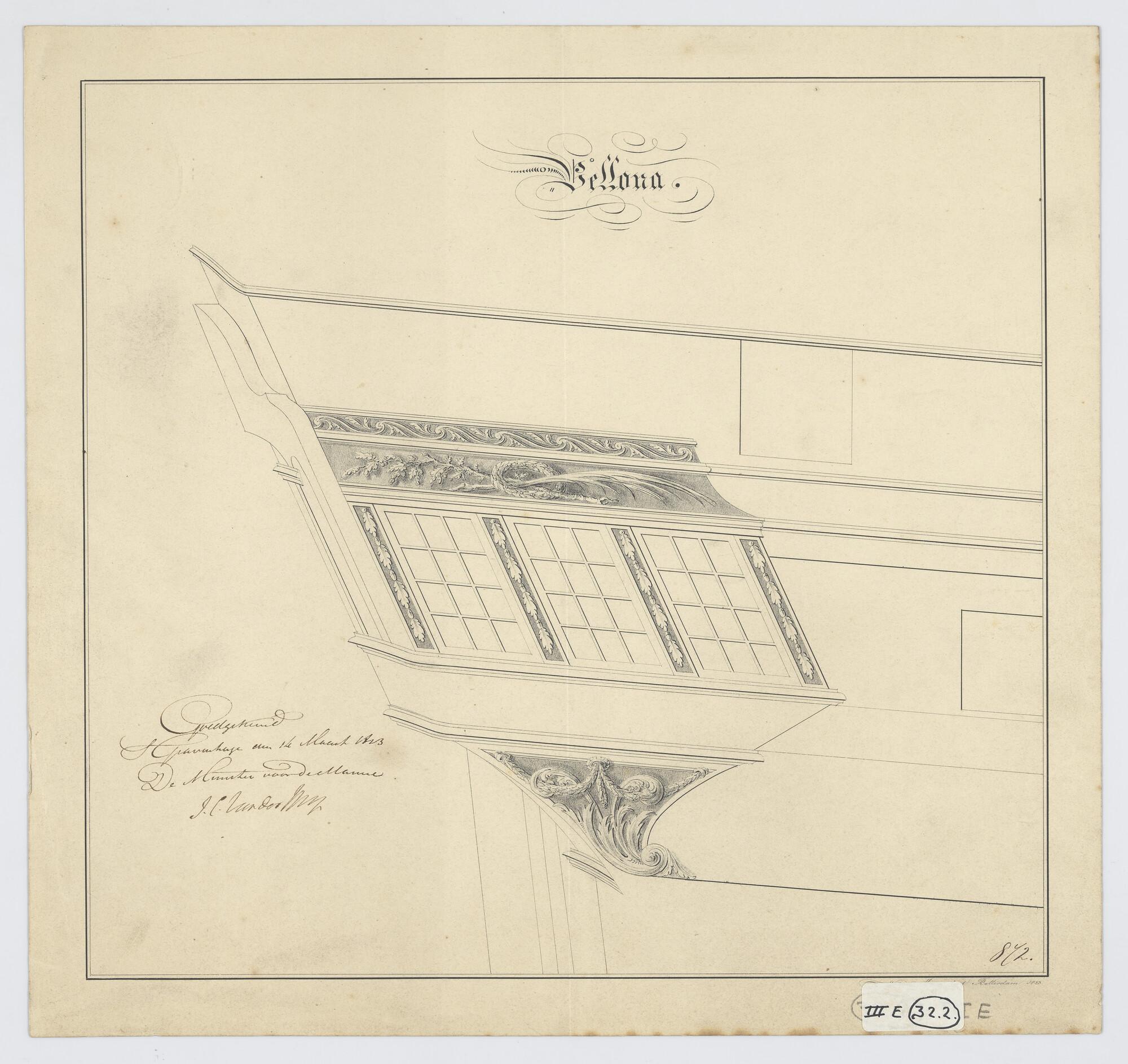 Galerij met drie ramen waarboven palmtak en eikenlooftak van het fregat 'Bellona' van 44 stukken.