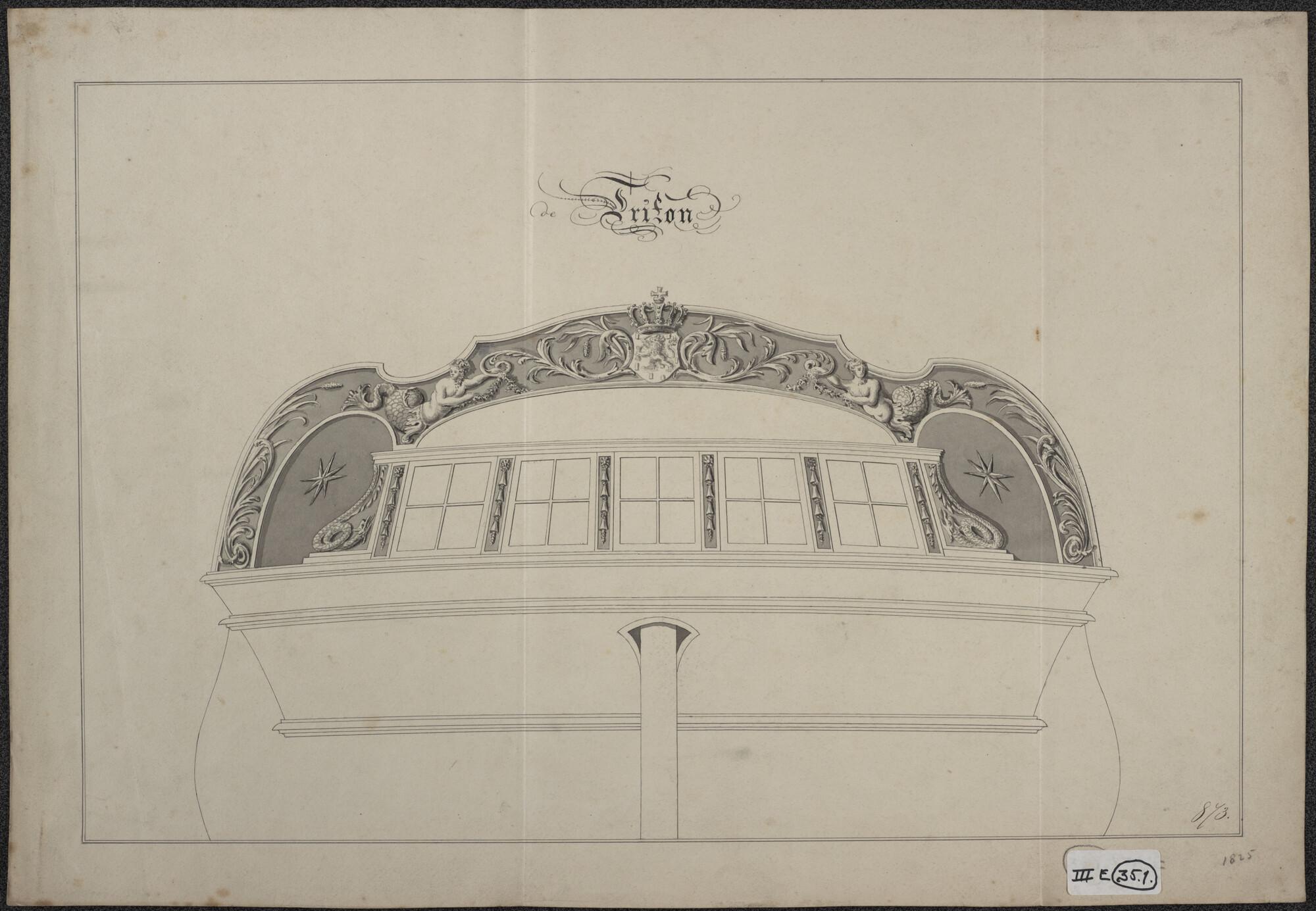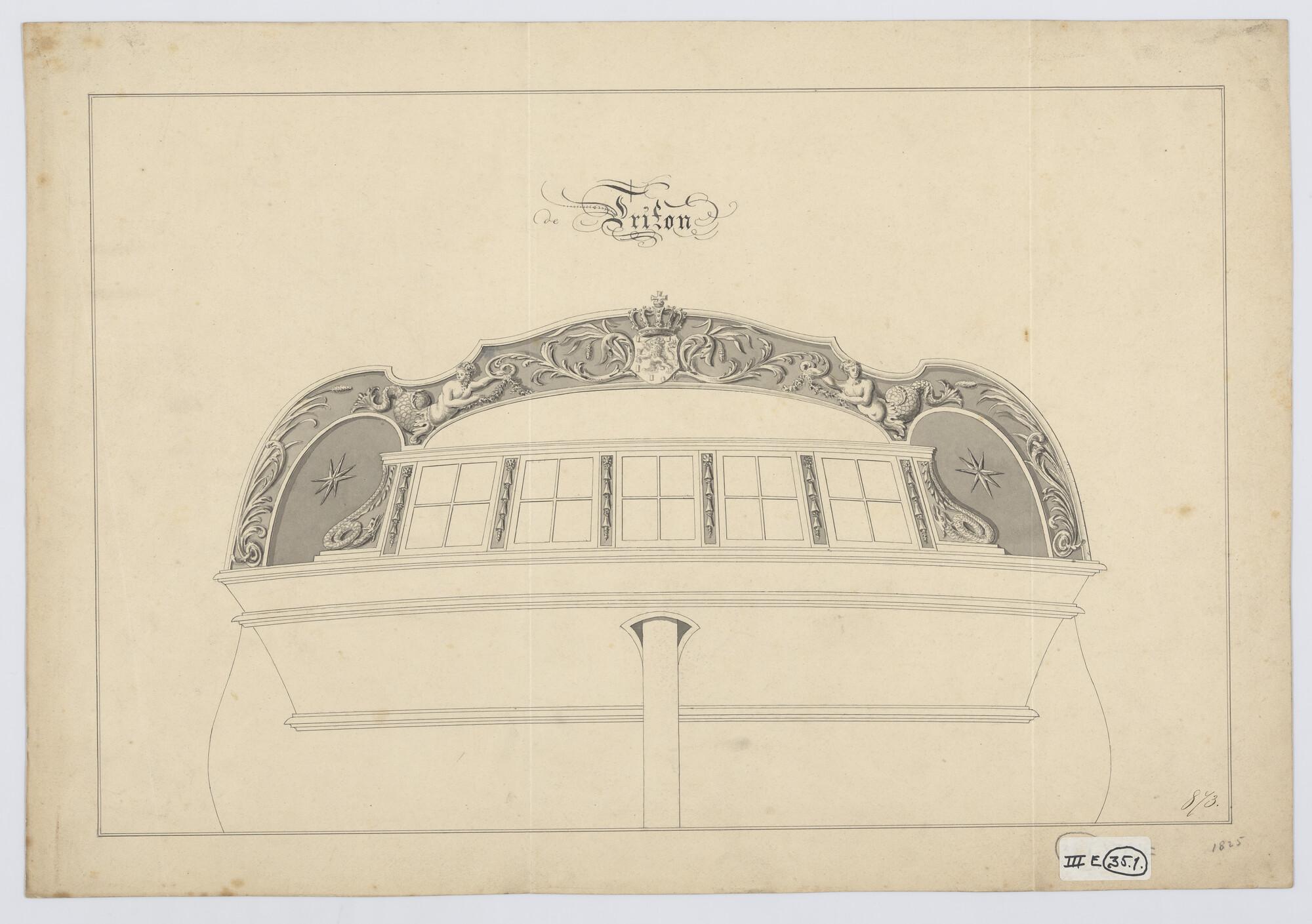 Ontwerp spiegel met 5 ramen van het kuilkorvet 'Triton' van 28 stukken.